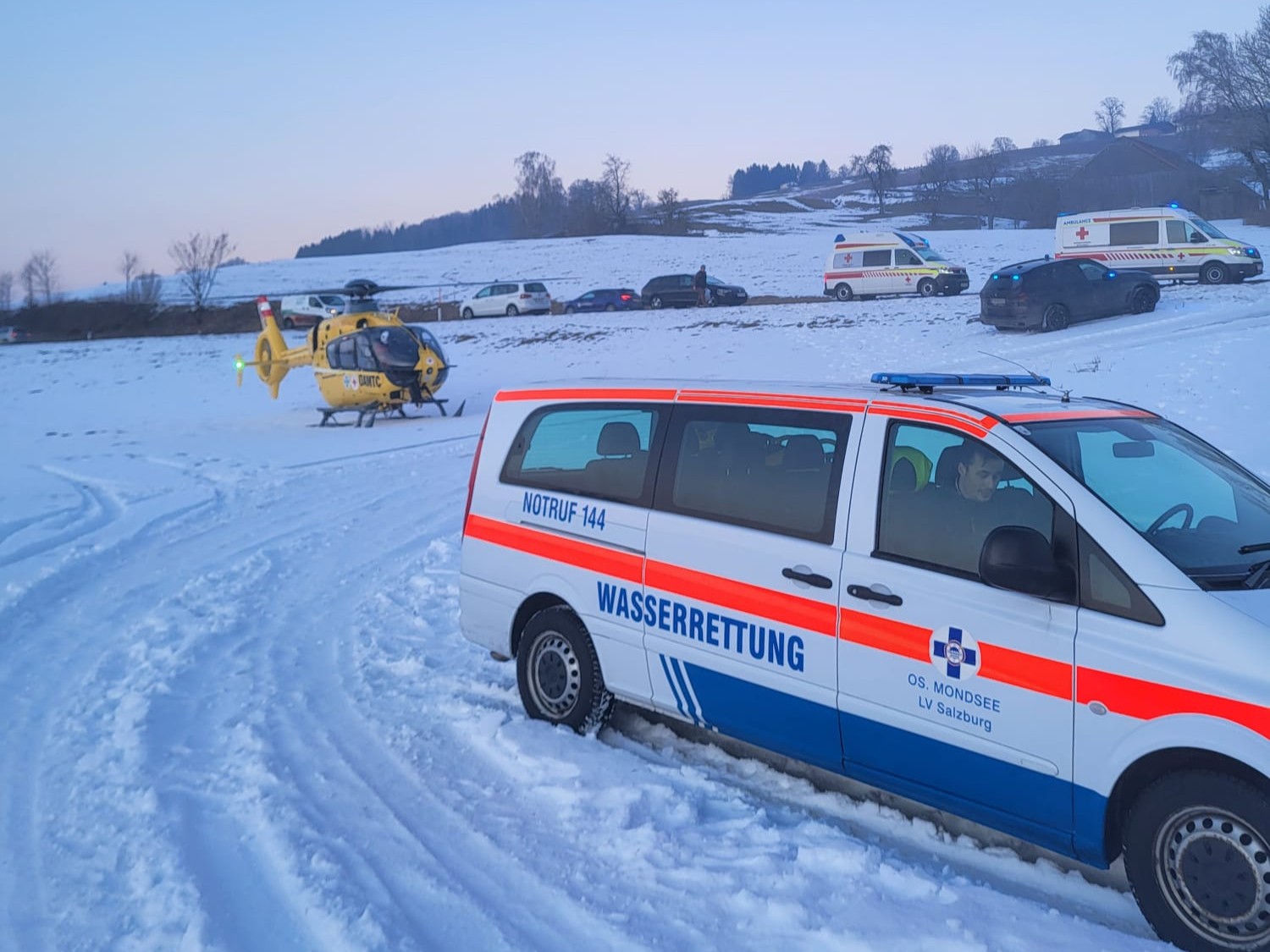 Montagnachmittag mussten am Irrsee zwei im Eis eingebrochene Personen von einem Rettungshubschrauber geborgen werden. Ein Ersthelfer fiel ebenfalls durch das Eis, konnte sich aber selbst befreien.