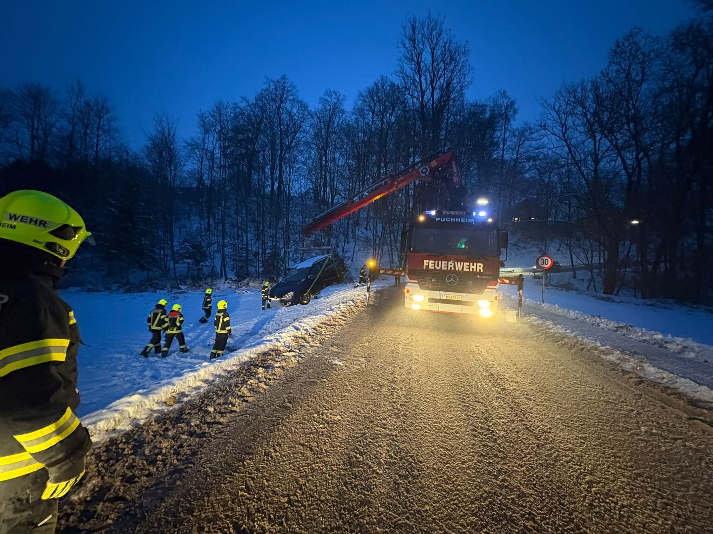 Aufgrund der eisigen Straßenverhältnisse mussten die Einsatzkräfte der Feuerwehr Puchheim innerhalb kurzer Zeit zu zwei Fahrzeugbergungen ausrücken.