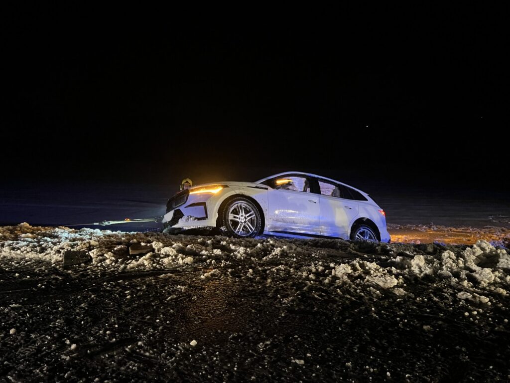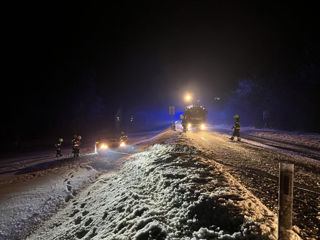 Kurz vor Mitternacht kam es zu einem weiteren Einsatz: Ein PKW kam in einer Kurve von der Bundesstraße ab und rutschte in ein angrenzendes Feld. Das Fahrzeug wurde schonend mittels Seilwinde geborgen und auf einem befestigten Streifen neben der Fahrbahn abgestellt. Lenker und Beifahrer blieben auch bei diesem Unfall glücklicherweise unverletzt. Der betroffene Straßenabschnitt war während der Bergung gesperrt und entsprechend abgesichert.