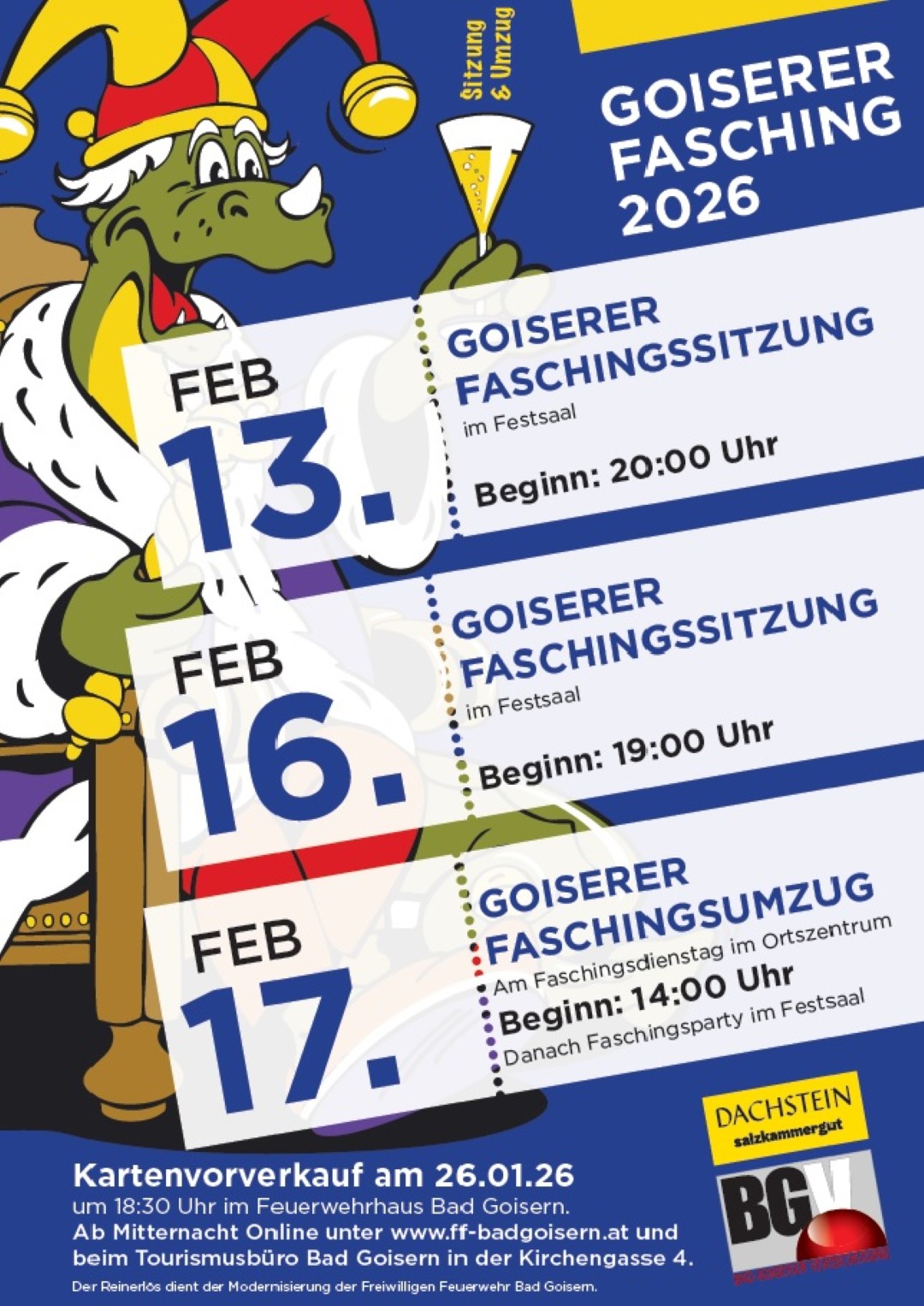 Karten für die Faschingssitzungen gibt es am 26. Jänner ab 18:30 Uhr im Sicherheitszentrum Bad Goisern, danach ab Mitternacht online unter www.ff-badgoisern.at sowie gegen Barzahlung im Tourismusbüro Bad Goisern.