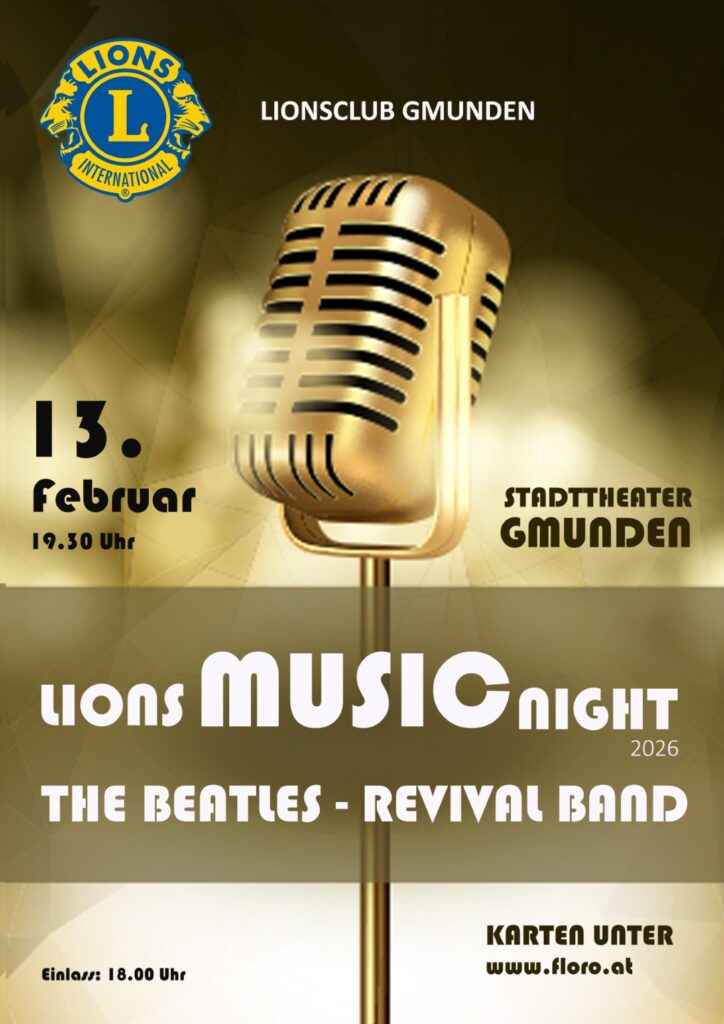 Am 13. Februar 2026 ab 19:30 Uhr lädt der Lionsclub Gmunden zur Lions Music Night ins Stadttheater. Auf der Bühne steht die renommierte Beatles Revival Band aus Frankfurt, die mit großer Leidenschaft und musikalischer Präzision den unverwechselbaren Sound der legendären Fab Four wiederaufleben lässt.