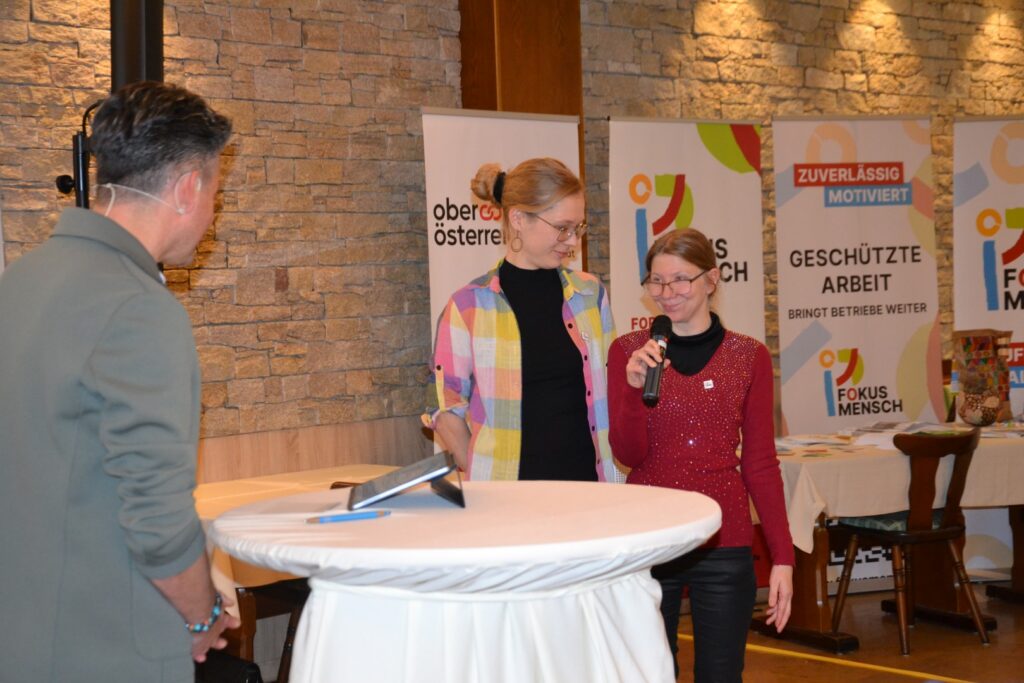 Bei fröhlicher Atmosphäre gab es die Gelegenheit, Fokus Mensch sowie dessen Angebote näher kennenzulernen. Mit drei Kurzfilmen gaben wir Einblicke in unsere Arbeit – von der Personenzentrierten Planung über Berufliche Qualifizierung bis hin zu Wohnen bei Fokus Mensch. Noch stärker als die Filme waren jedoch die Menschen dahinter: Begleitete Personen sowie Mitarbeiterinnen und Mitarbeiter kamen auf die Bühne und erzählten in kurzen Interviews mit Moderator Gernot Pachernigg offen, echt und voller Stolz von ihrem Arbeitsleben. Alle bereicherten mit ihrer persönlichen Sicht auf die Dinge die Gesamtvorstellung. Besonders erfreulich: Viele nutzten den Tag als Gelegenheit, um miteinander ins Gespräch zu kommenund auch unsere handgefertigten Produkte am Verkaufstisch zu entdecken. Mehrere Gäste ließen es sich nach der Veranstaltung nicht nehmen, sich nochmals beim Team von Fokus Mensch für den gelungenen Tag zu bedanken.