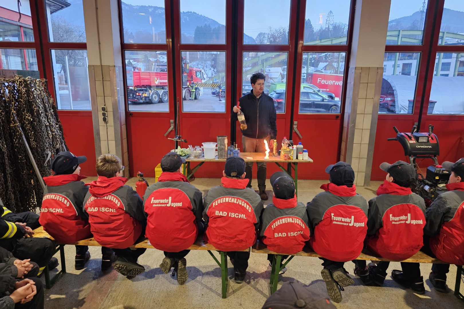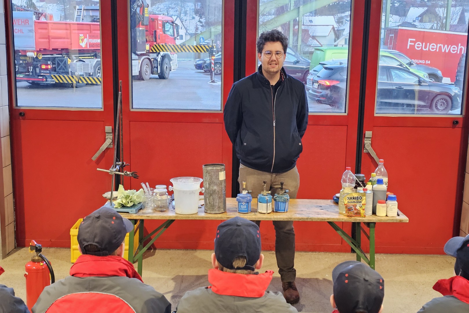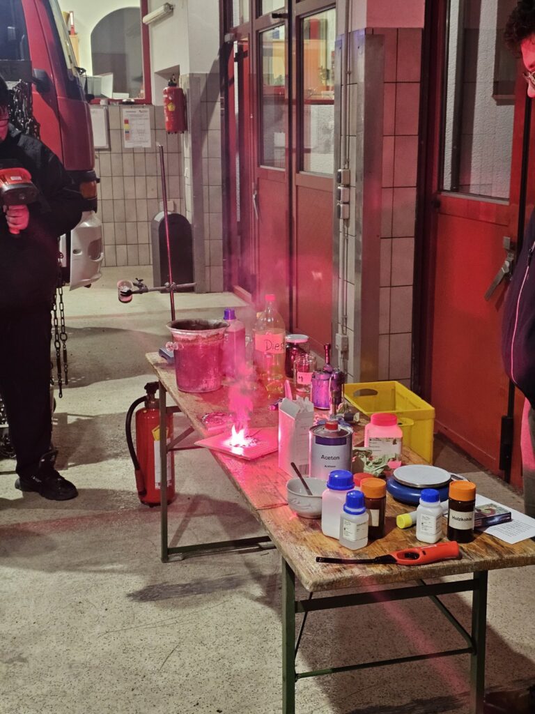 Lukas Hayböck, seines Zeichens aktiver Chemielehrer und Bruder von Jugendbetreuer David, besuchte den wöchentlichen Übungsabend. Lukas erklärte den interessierten Burschen wie ein Fettbrand entsteht und ging auf die chemischen Vorgänge bei einer Verbrennung ein. Nach dem Theorieteil wurde die Fahrzeughalle kurzerhand zum Chemiesaal umfunktioniert. Die Retter von morgen staunten nicht schlecht als der zuvor besprochene Fettbrand in der Praxis gezeigt wurde. Auch ein bengalisches Feuer wurde simuliert und die Gefahren dabei besprochen.