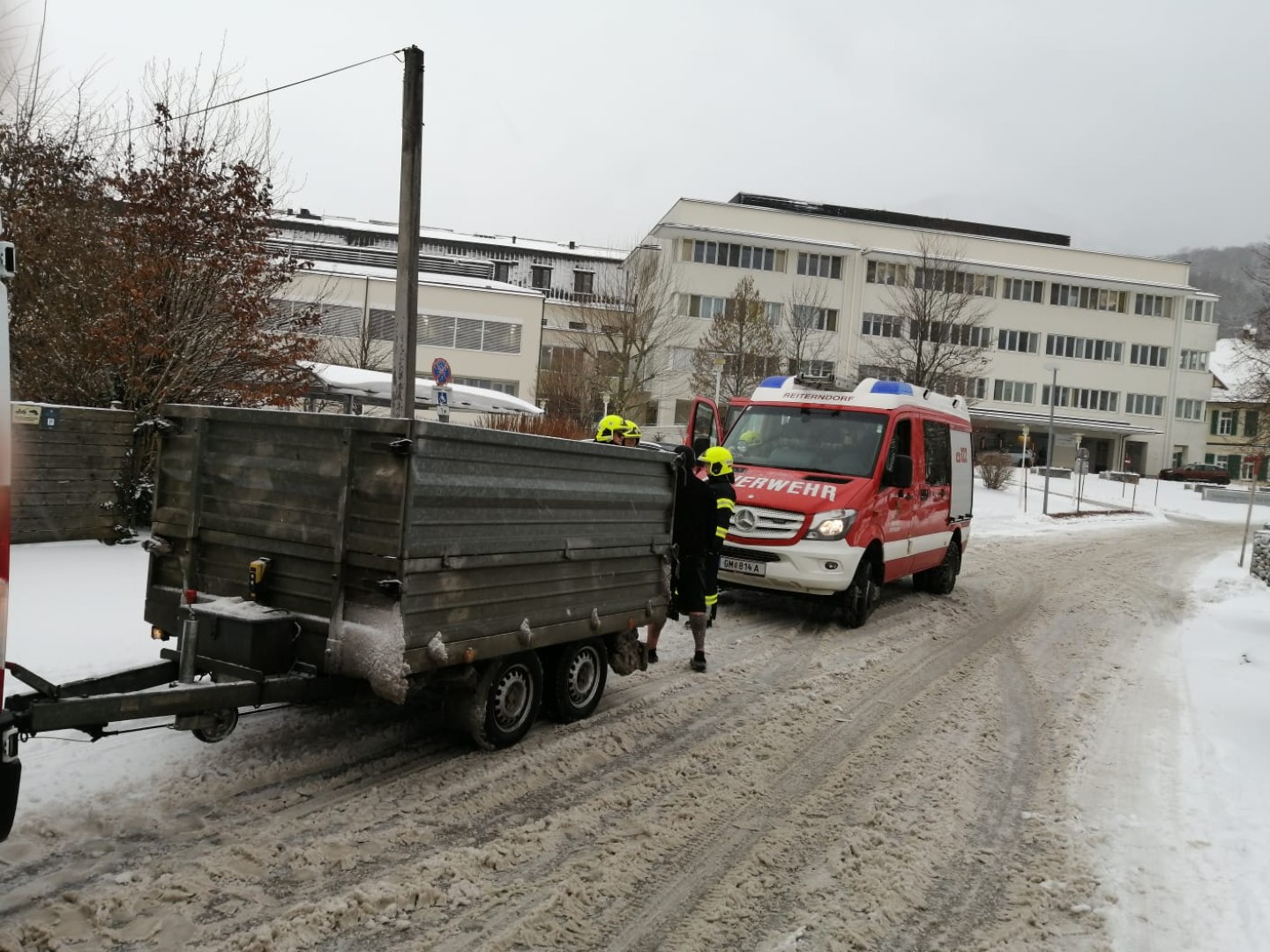 Montagvormittag wurde die Feuerwache Reiterndorf zu einer Fahrzeugbergung in die Doktor-Mayer-Straße alarmiert. Ein Kleintransporter mit Anhänger war auf der rutschigen Fahrbahn während eines Abbiegemanövers in einer Kurve hängen geblieben und konnte seine Fahrt nicht mehr fortsetzen.