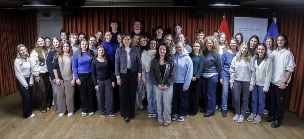 Das Bundeskanzleramt fördert Schülerreisen zu den EU-Institutionen. Die HLW Bad Ischl hat dieses Angebot genutzt und ist mit drei Schulklassen nach Brüssel gereist. Gestern hat Europaministerin Claudia Bauer (vormals Plakolm) im Rahmen ihres Brüssel-Aufenthalts anlässlich des Europa-Ministertreffens (Rat für Allgemeine Angelegenheiten) die Schülerinnen und Schüler in der Ständigen Vertretung Österreichs bei der EU getroffen. Dabei gab sie Einblicke in die Arbeitsweise der EU und die Rolle der Mitgliedstaaten und stand der Klasse anschließend Rede und Antwort zu ihren Fragen rund um Europa.