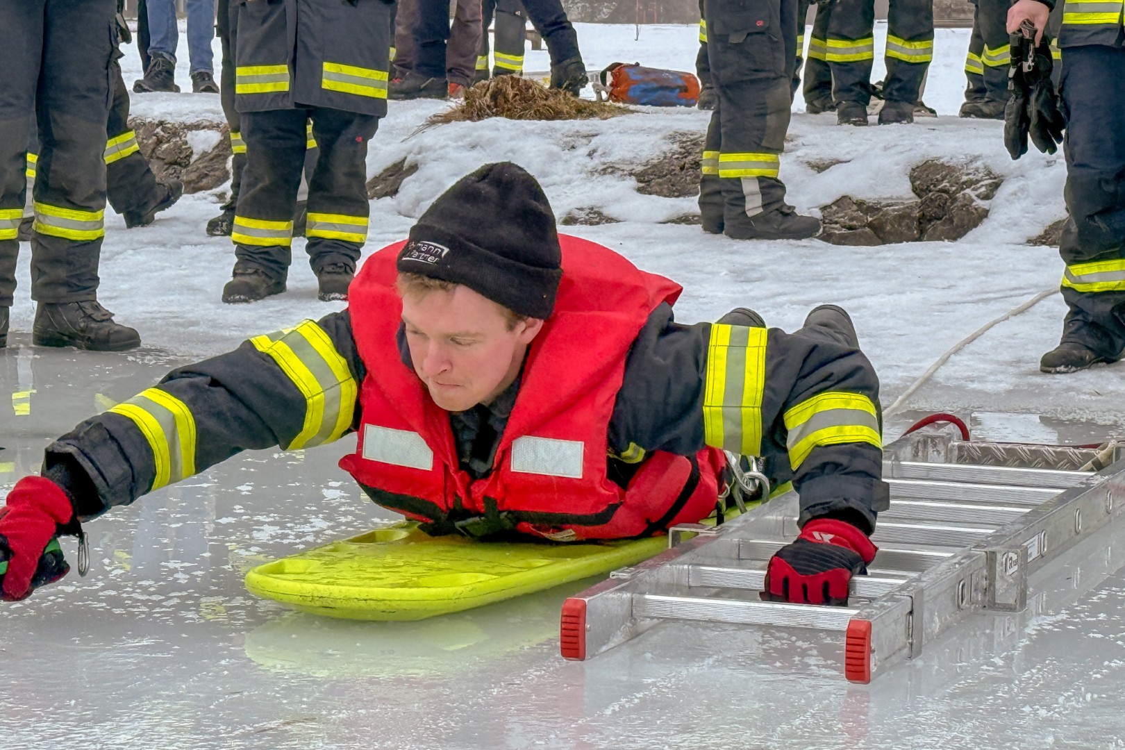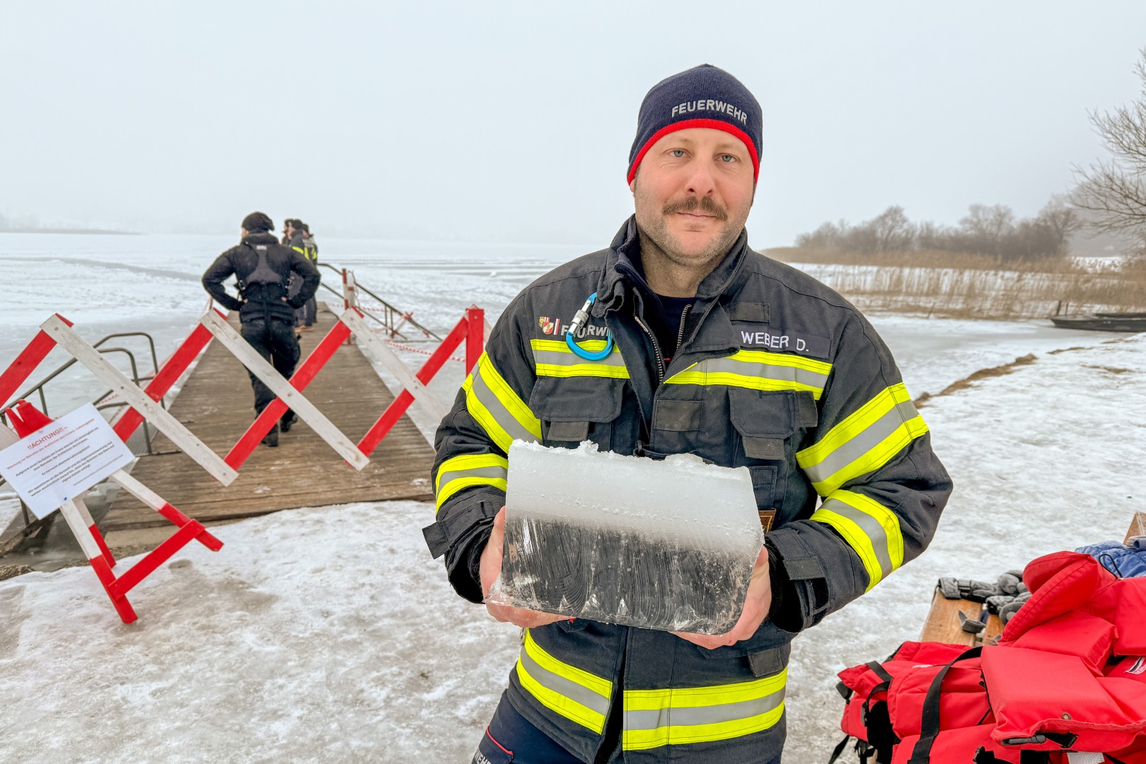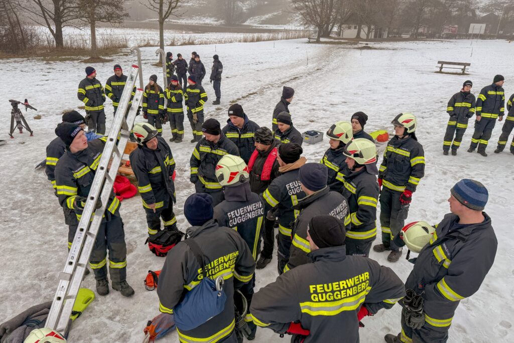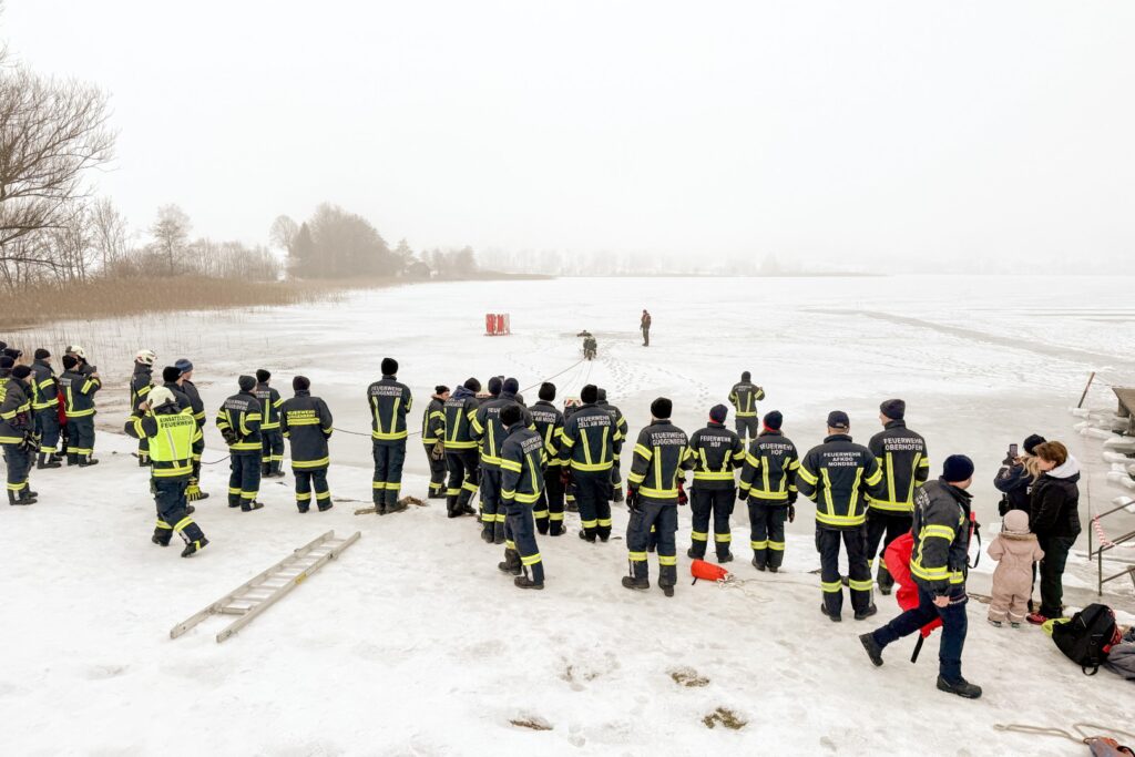 Der Feuerwehrtaucher und Tauchgruppenleiter Jonathan Hansel schulte und vertiefte das vorhandene Wissen der Einsatzkräfte zum Thema Eisrettung, Unterkühlung und Belastbarkeit der Eisfläche. Bevor es zu den Praxisübungen auf den Irrsee ging, berichtete noch der Polizist, der versucht hatte, die eingebrochenen Frauen zu retten von der Rettungsaktion.