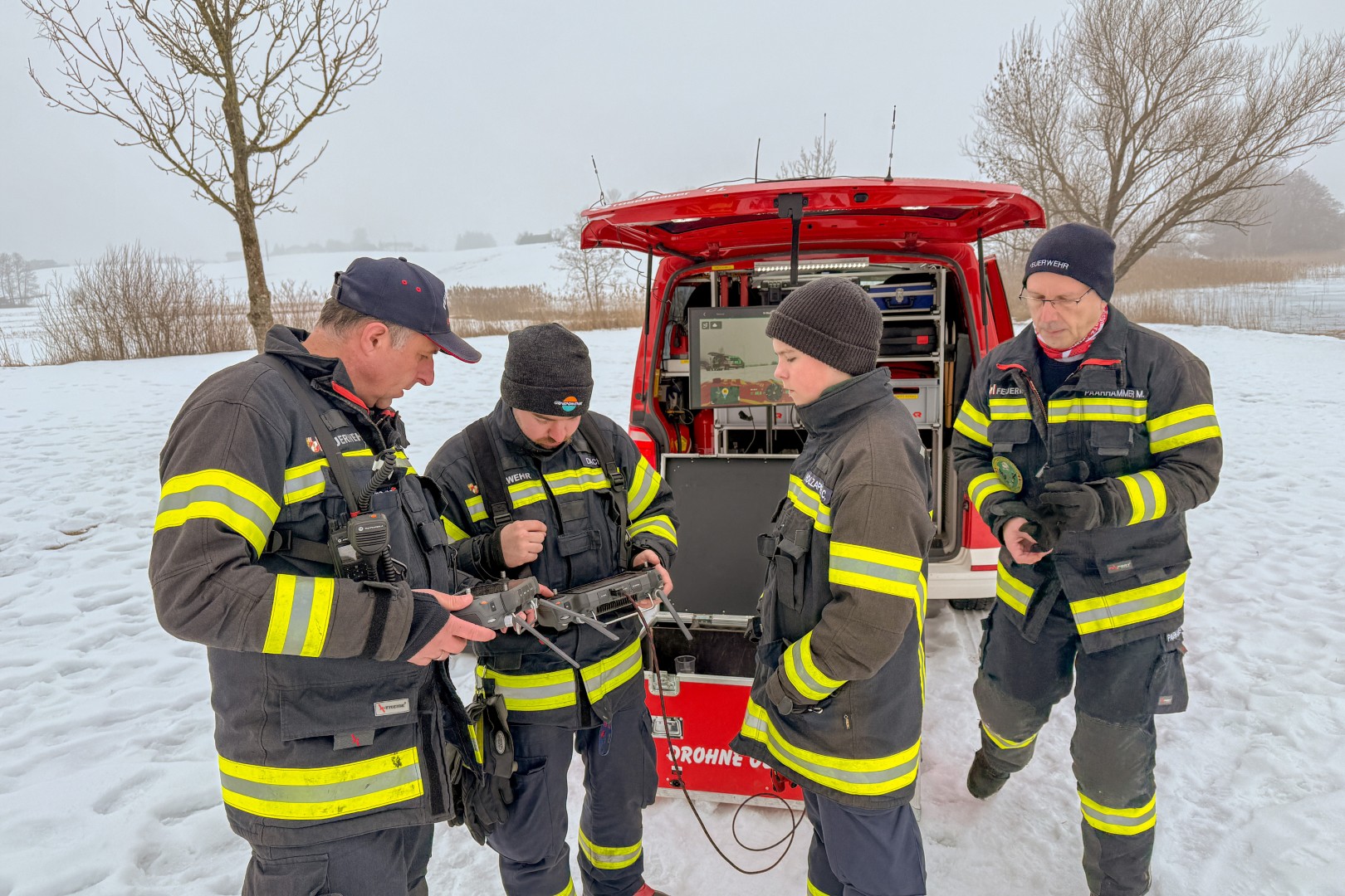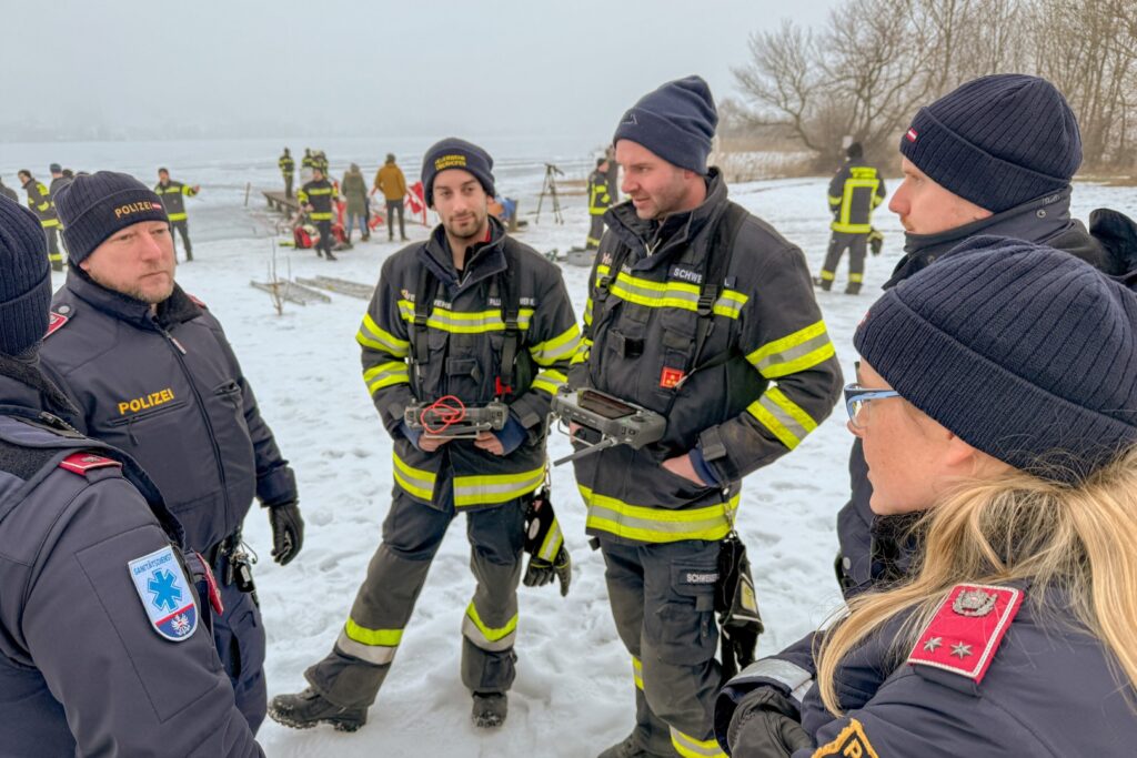 Am See wurde dann mit verschiedenen Einsatzmitteln die Rettung einer eingebrochenen Person geübt. Die Drohnen der Feuerwehrdrohnengruppe des Abschnitts Mondsee kümmerten sich um die Lagedarstellung und die Räumung des Gefahrenbereichs mittels Lautsprecherdurchsagen. Aufgrund des Nebels, der hohen Luftfeuchtigkeit und der Temperatur von -2 Grad kam es immer wieder zu leichten Propellervereisungen, somit konnten Drohnenflüge nur sehr selektiv und in geringer Höhe erfolgen.