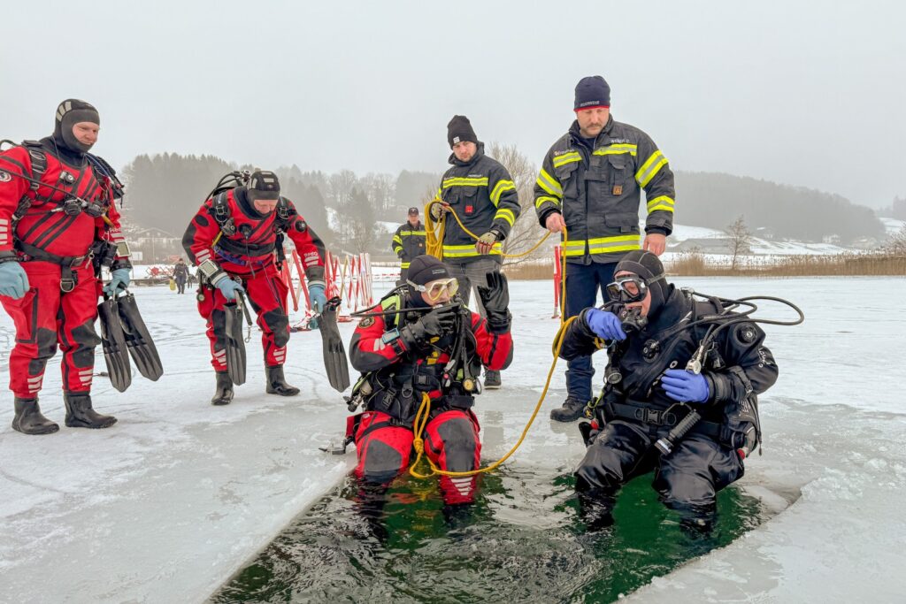 Nach dem dramatischen Einsatz und der erfolgreichen Hubschrauberrettung von zwei eingebrochenen Damen am Irrsee am 21. Jänner 2026, organisierte der Ausbildungsleiter des Feuerwehrabschnittes Mondsee Daniel Weber gemeinsam mit der Feuerwehr Zell am Moos eine realistische Eisrettungsübung mit anschließenden Eistauchgängen der Feuerwehrtaucher.