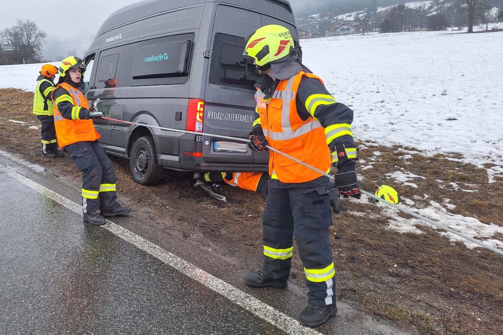Unter Einsatz der Bergeseilwinde des Rüstlöschfahrzeugs gelang es den Einsatzkräften, das Fahrzeug wieder auf die befestigte Fahrbahn zu ziehen. Um Stauungen zu minimieren, wurde die Einsatzstelle auf der vielbefahrenen Bundesstraße entsprechend abgesichert sowie eine wechselseitige Verkehrsregelung eingerichtet.