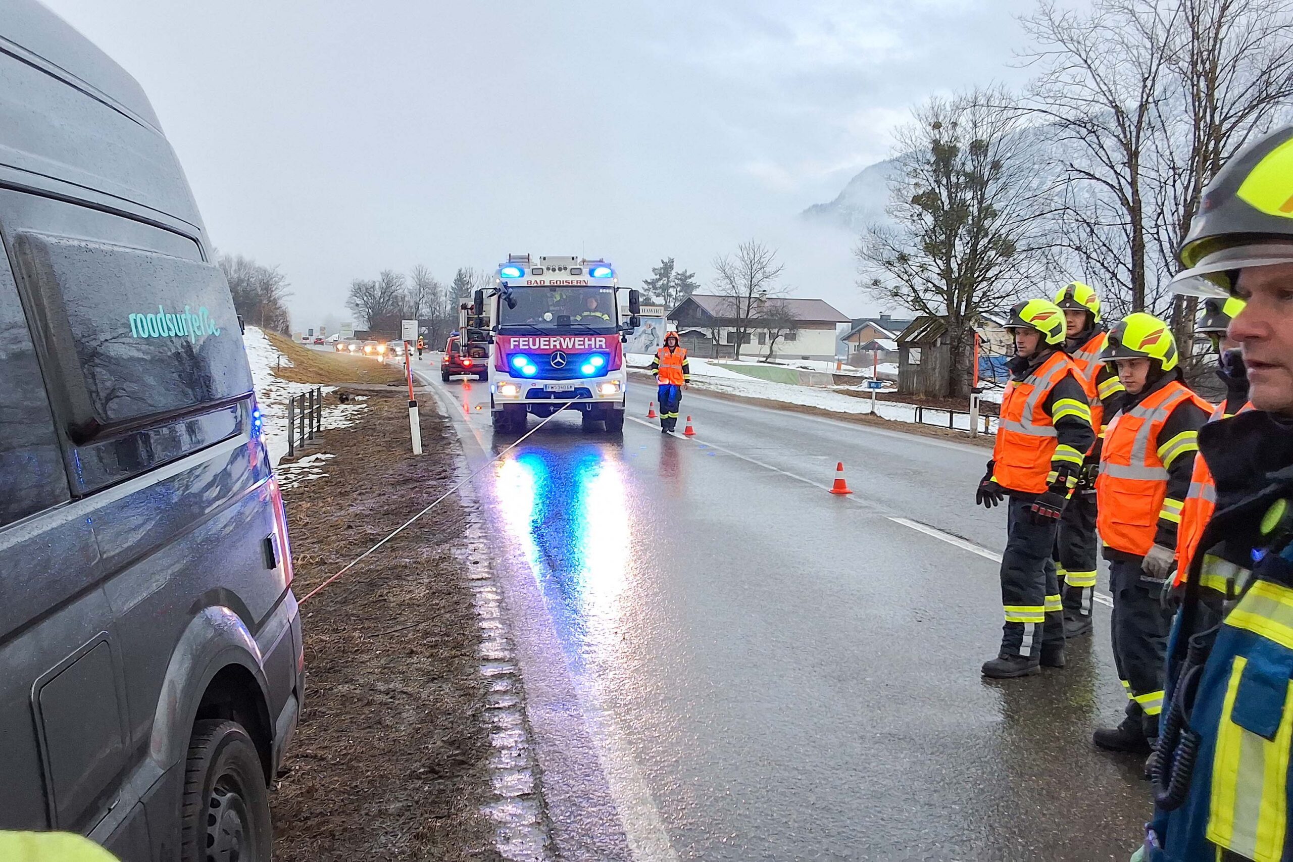 Guter Rat war gefragt, der dann von einem hilfsbereiten Einheimischen kam: Denn die herbeigerufenen Kräfte der Feuerwehr Bad Goisern konnten den Kleinbus schließlich wieder flott für die Weiterfahrt machen.