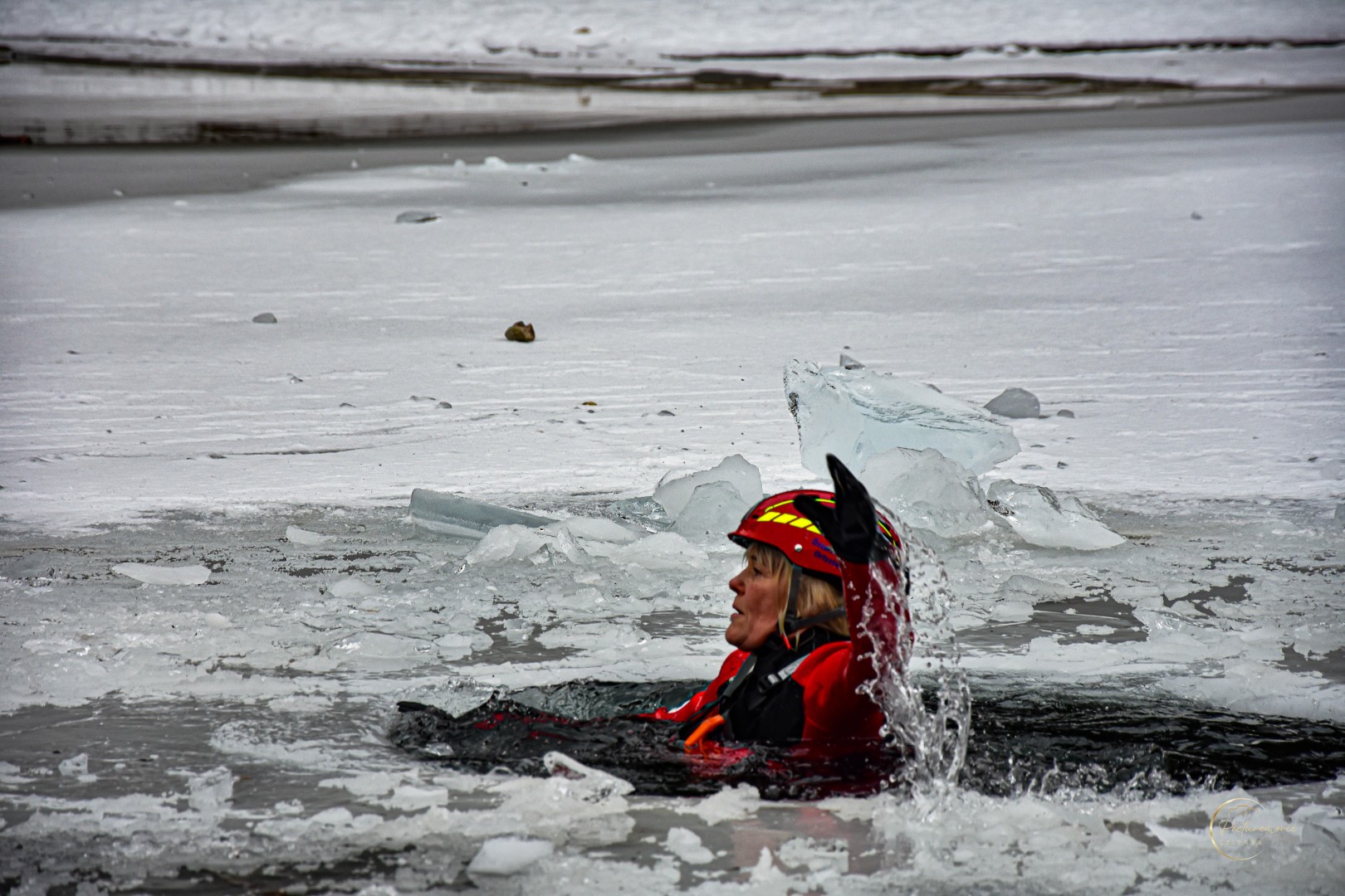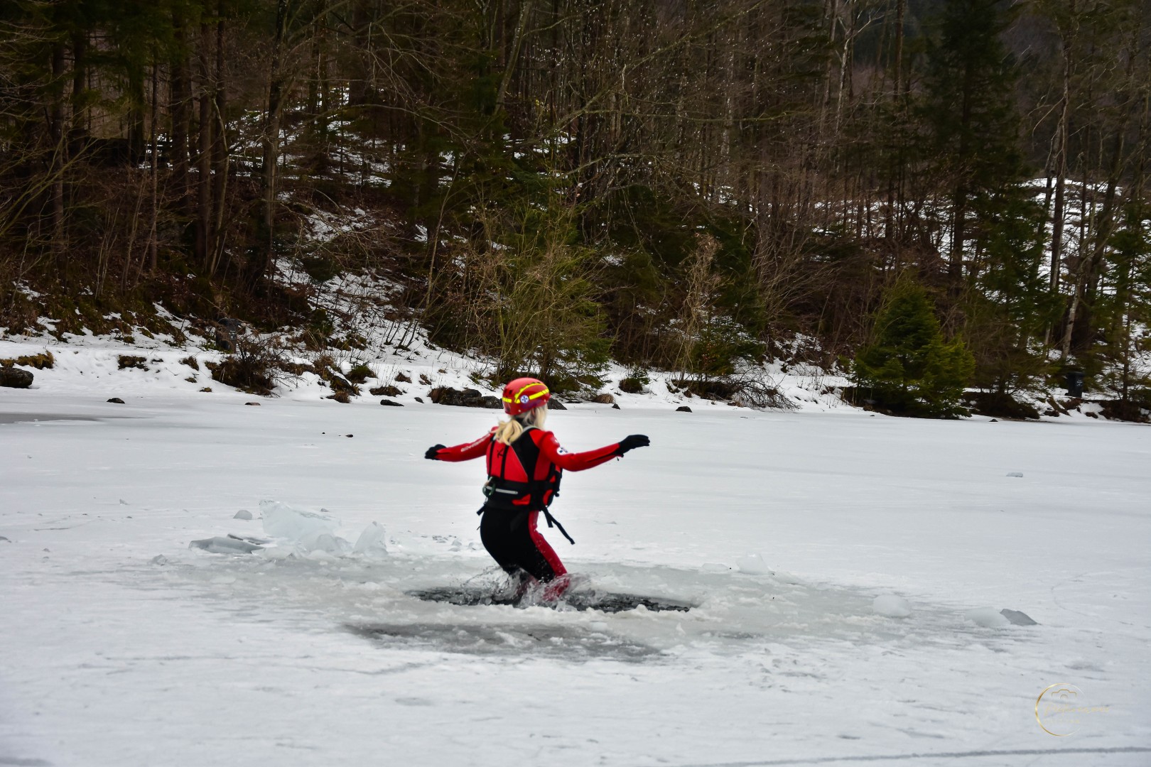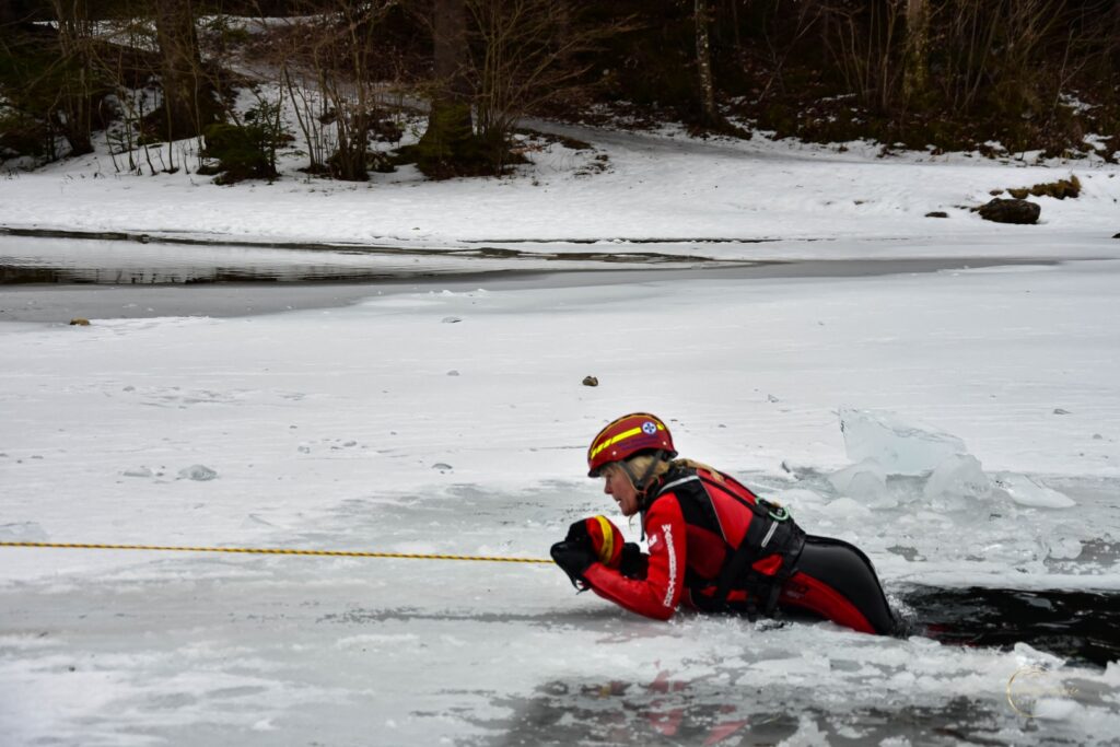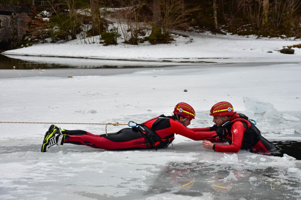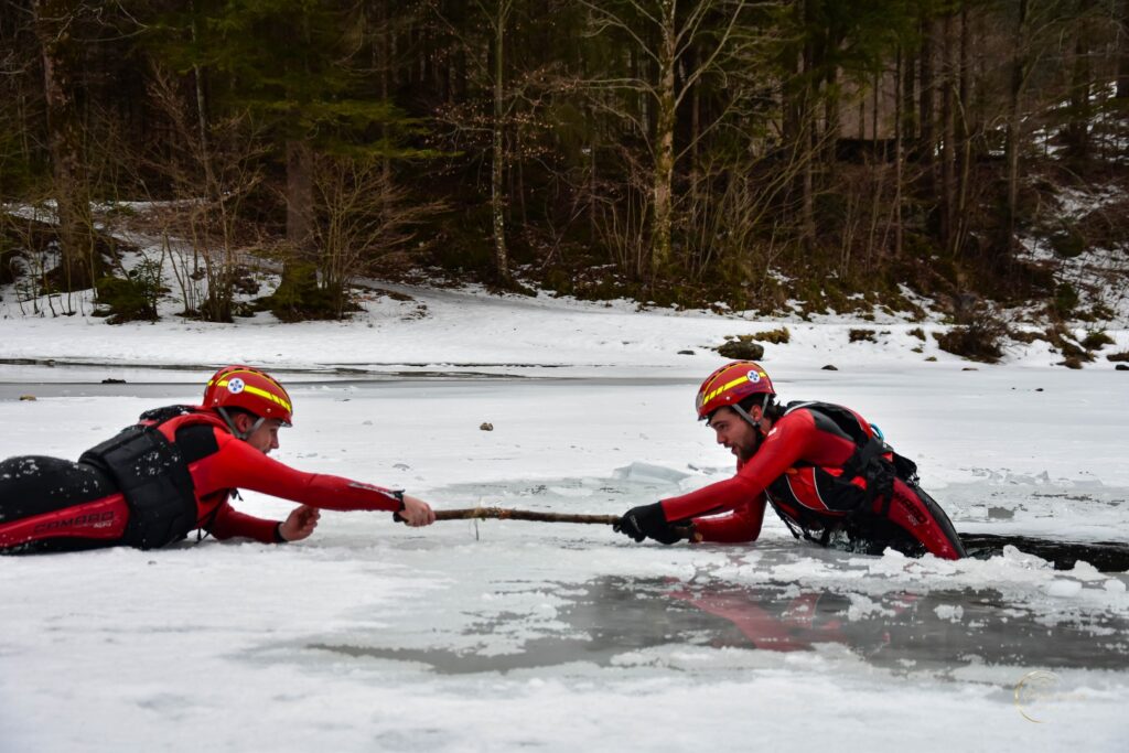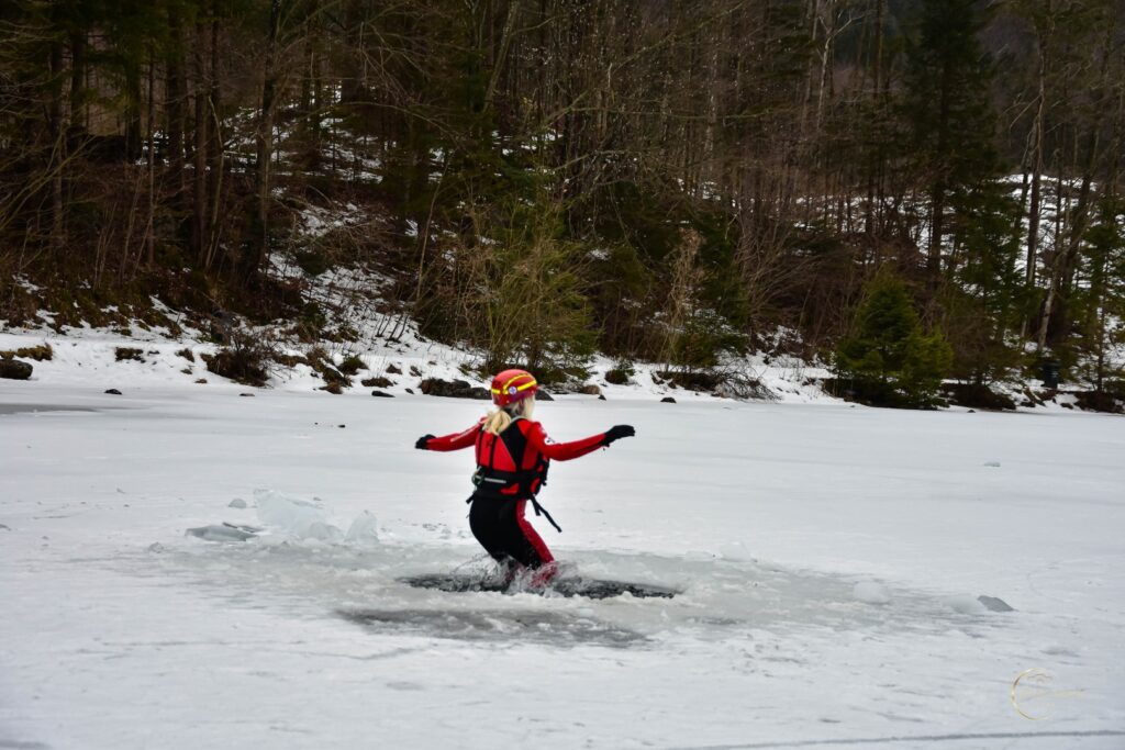 Zu Beginn der Veranstaltung informierte die Wasserrettung über wichtige Einflussfaktoren auf die Eisbildung sowie über die erforderliche Eisdicke, um Gefahren besser einschätzen zu können. Anschließend folgten eindrucksvolle Demonstrationen verschiedener Rettungsmethoden.