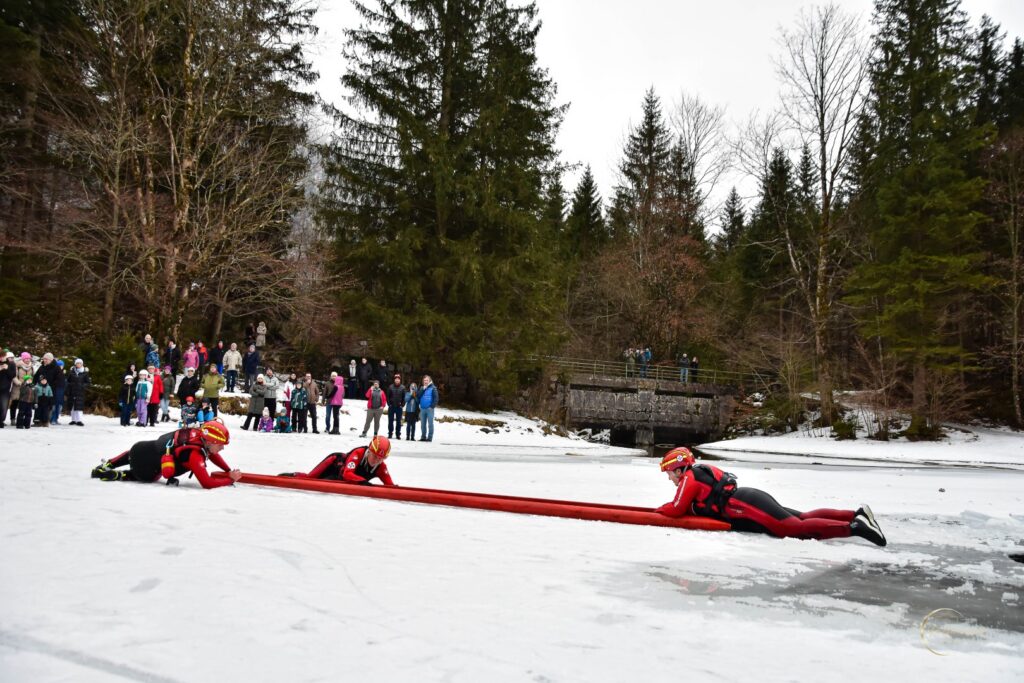 Die Wasserrettung Ebensee veranstaltete kürzlich am Vorderen Langbathsee eine Schauübung zum Thema Eisrettung, bei der interessierten Besucherinnen und Besuchern praxisnah gezeigt wurde, wie Rettungen in Notfällen am und im Eis ablaufen können.