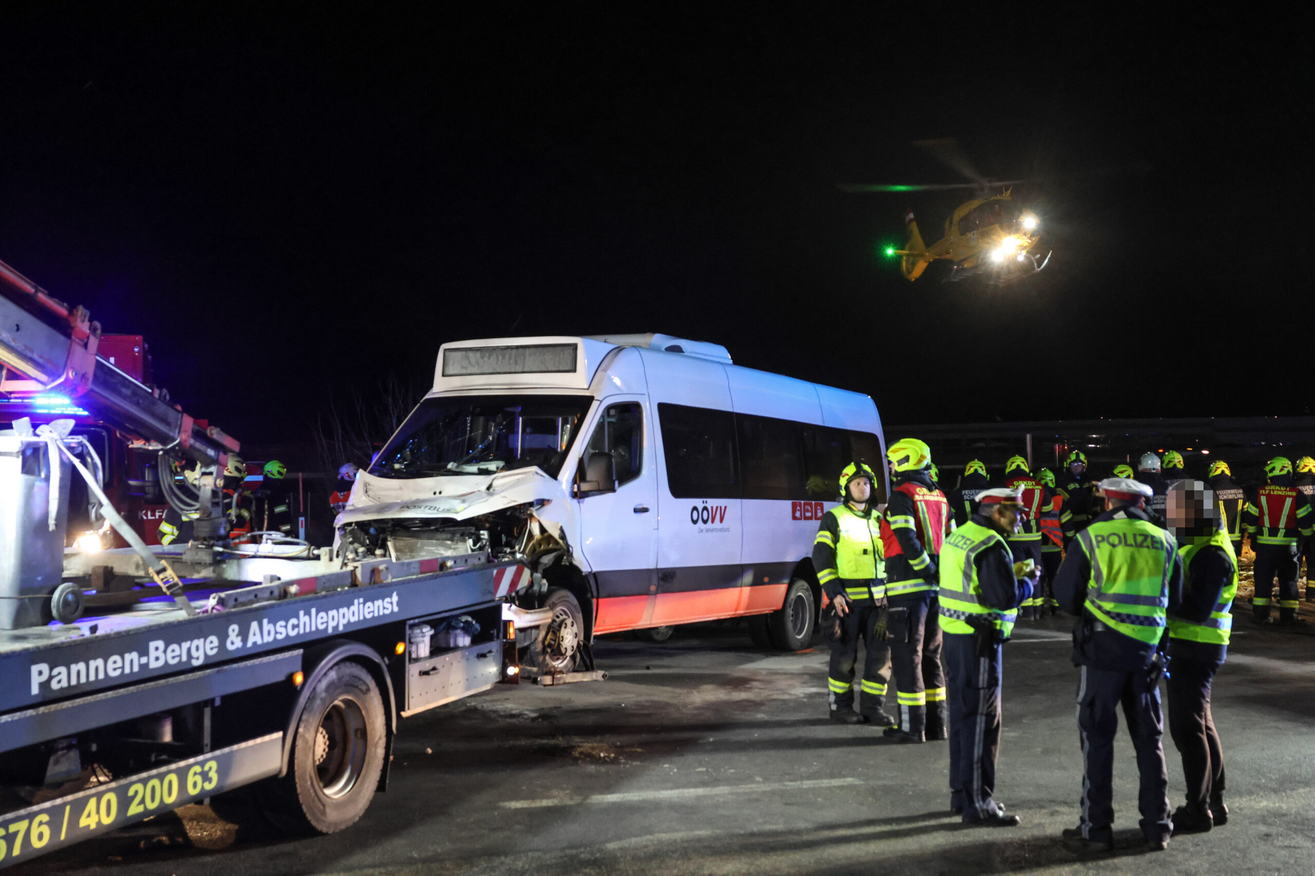 Aus noch unbekannten Gründen kollidierten dort ein LKW-Sattelzug und ein kleinerer Linienbus. Der Linienbus wurde bei dem Unfall schwer, der LKW erheblich beschädigt. Die Einsatzkräfte von vier Feuerwehren wurden zur Personenrettung an die Einsatzstelle alarmiert, ebenso Rettungsfahrzeuge und der Notarzthubschrauber Christophorus 14. Nach Abschluss der Rettungsarbeiten führten die Kräfte der Feuerwehren gemeinsam mit dem verständigten Abschleppunternehmen die Aufräumarbeiten an der Unfallstelle durch.