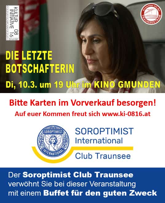 Unter dem Motto: Ein Abend für Frauen, Mut und Solidarität zeigt die www.ki-0816.at mit dem Soroptimist International Club Traunsee den Film „Die letzte Botschafterin“ – ein eindrucksvolles Zeichen für Bewusstmachen, Stellungnehmen und Handeln.