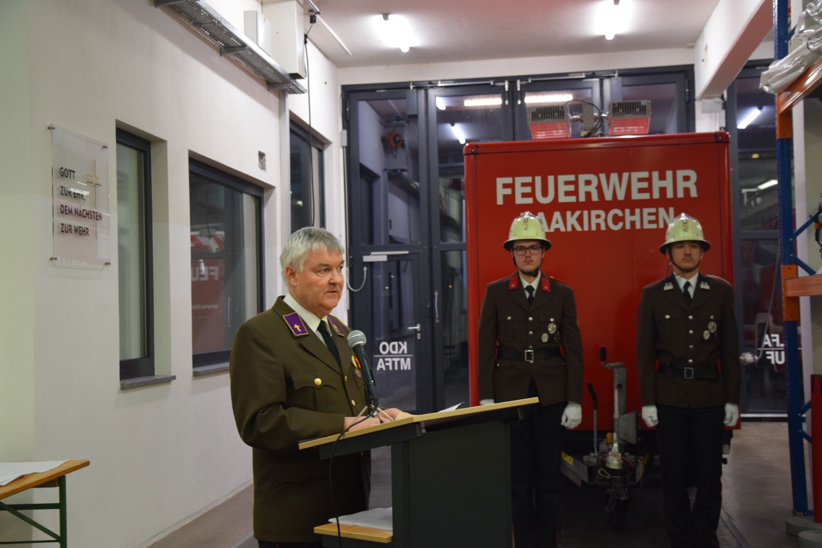 Nach der Begrüßung durch den Kommandanten ABI Jürgen Sturm und den Berichten der zuständigen Brandinspektoren des Fachdienstes für Schriftverkehr, Geräte und Finanzen erfolgte das Gedenken an alle verstorbenen Feuerwehrkameraden. Feuerwehrseelsorger Mag. Franz Starlinger nahm besonderen Bezug auf die vor kurzem verstorbenen Ehrenkommandanten Otmar Tischler und Peter Pinaucic. Anschließend erfolgte die Segnung des neuen Notstromanhängers der Feuerwehr.