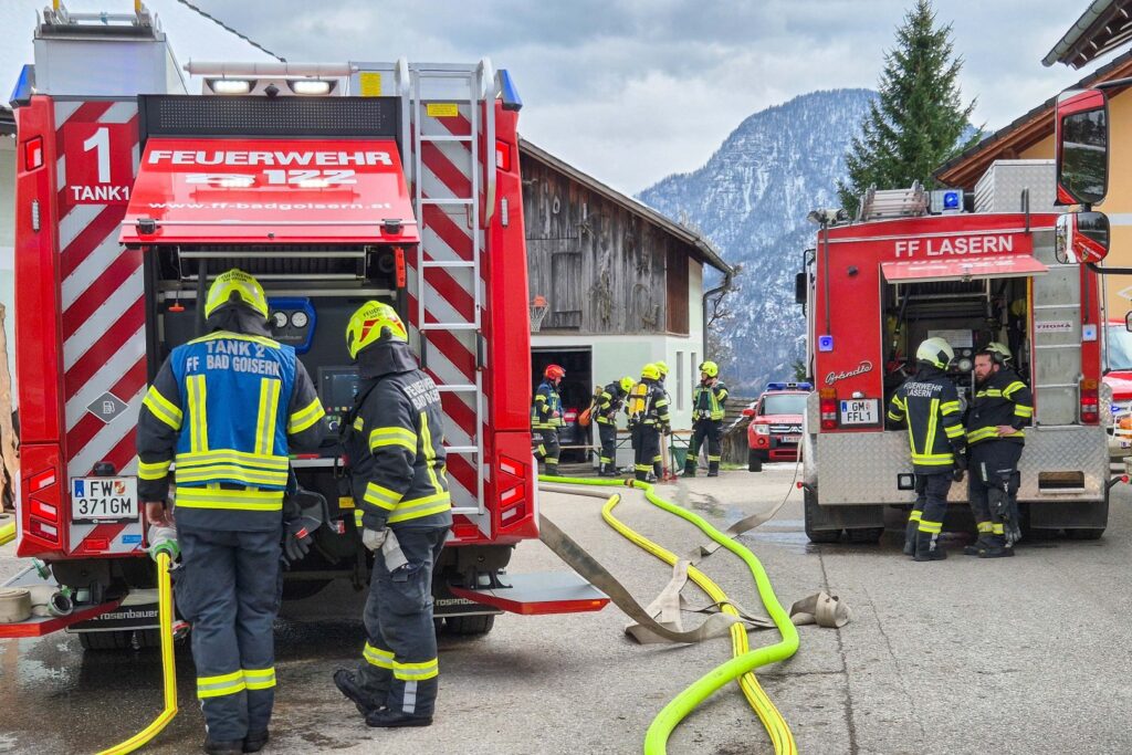 Der angenommene Brand eines landwirtschaftlichen Objektes hoch über dem Goiserertal diente am 28. März 2026 als Szenario für diese groß angelegte Einsatzübung der Goiserer Feuerwehren – mitsamt Unterstützung aus der Nachbargemeinde Bad Ischl.