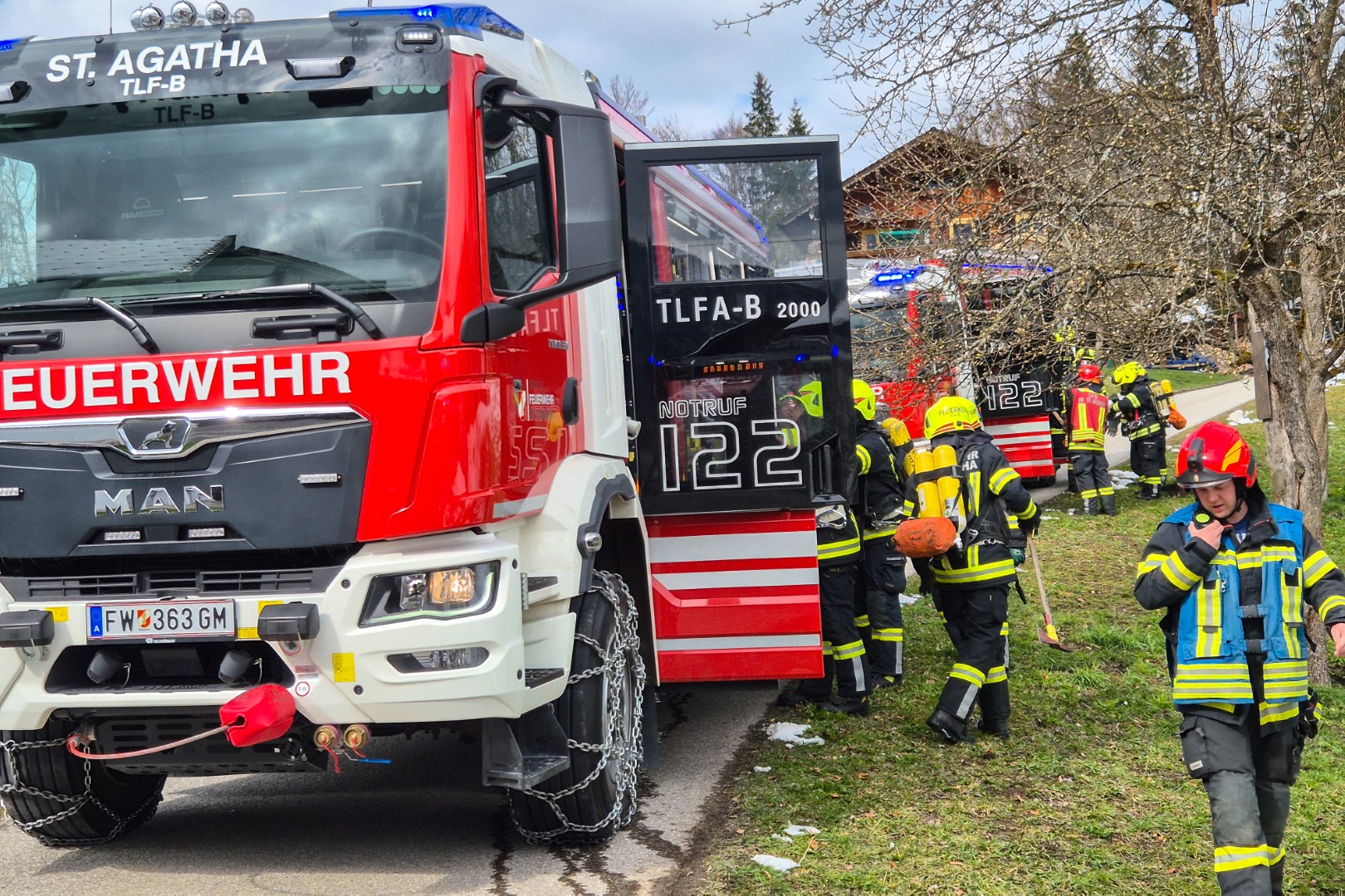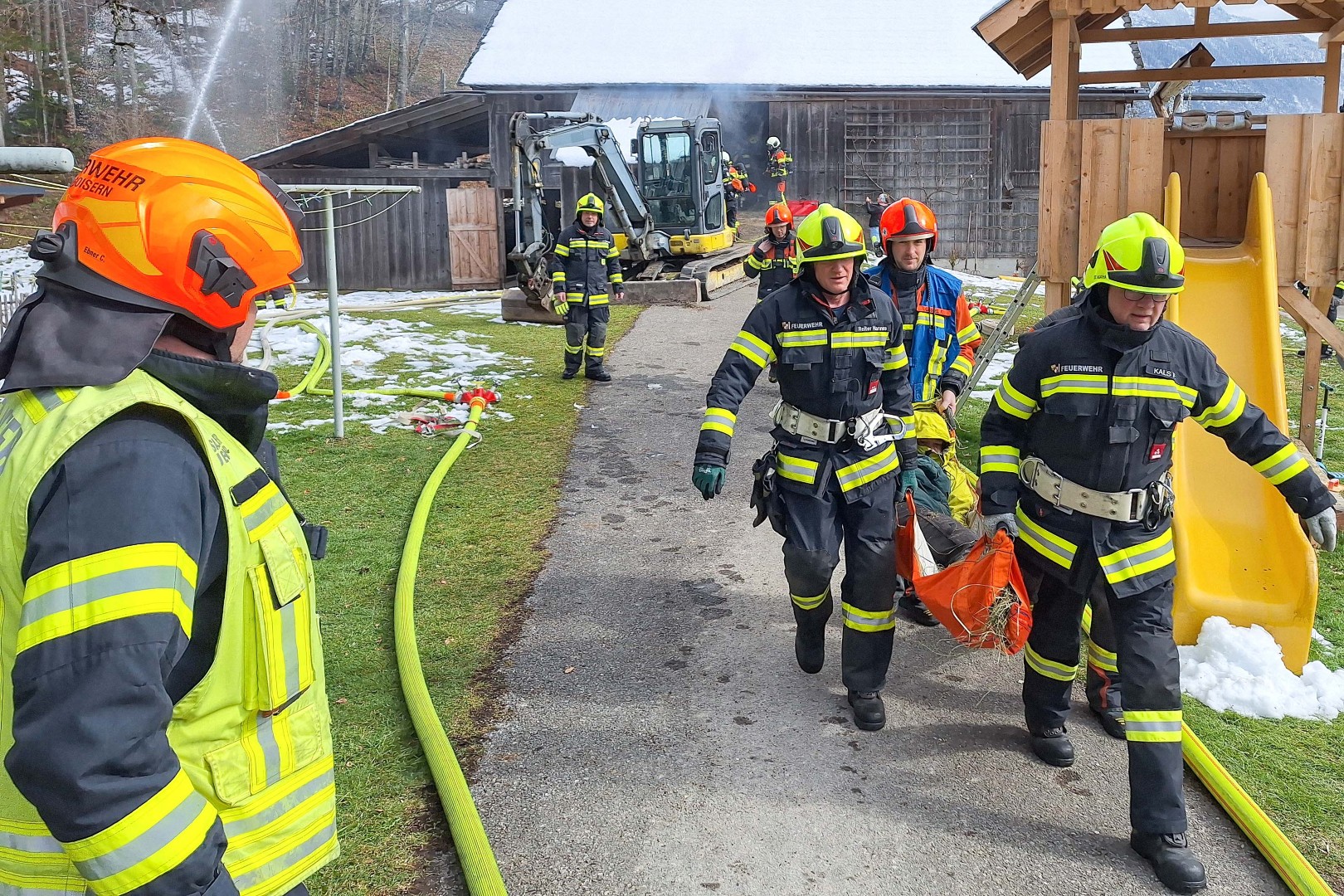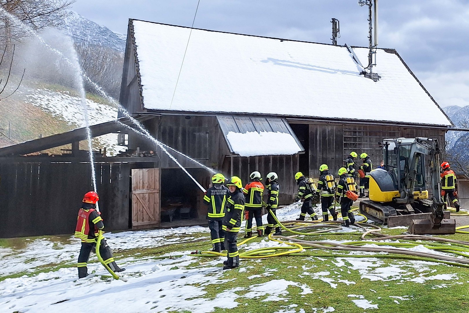 Der angenommene Brand eines landwirtschaftlichen Objektes hoch über dem Goiserertal diente am 28. März 2026 als Szenario für diese groß angelegte Einsatzübung der Goiserer Feuerwehren – mitsamt Unterstützung aus der Nachbargemeinde Bad Ischl.