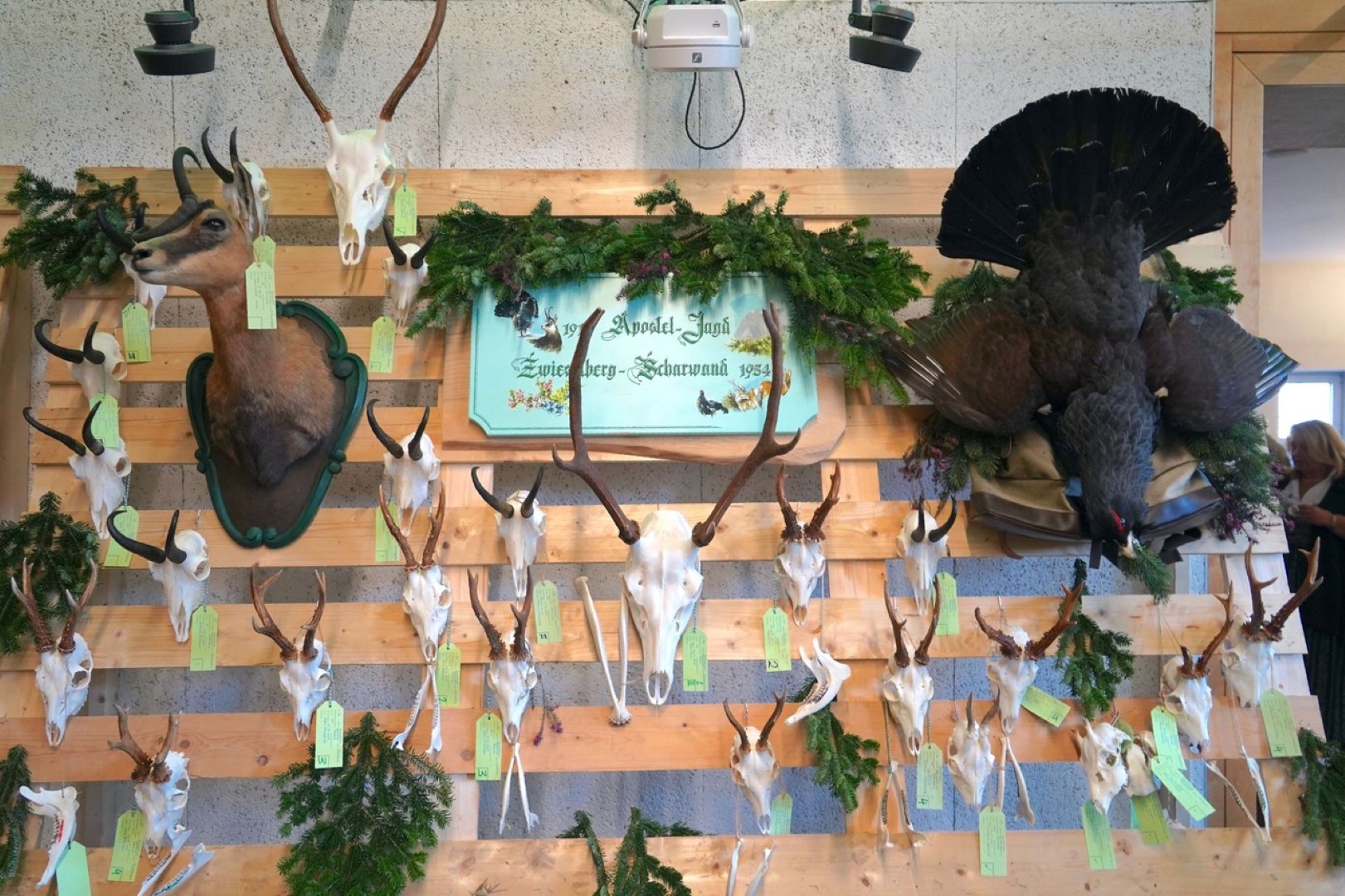 Ein hundertfaches Weidmanns Heil gab es heute Sonntag 22.3.2026 als Begrüßung beim Bezirksjägerball Gmunden 2026 im ALFA Veranstaltungszentrum in Steyrermühl. Im Eingangsbereich war die Trophäenschau des erlegten Wildes in Jagdreviere aufgeteilt ausgestellt. Ein imposanter Anblick mit auch außergewöhnlichen Trophäen wie ein Hirschhaupt mit einer in der Geweihstange verhängten Schneekette, in der sich der Hirsch verfangen hatte. Zu Beginn des Jägertages fand eine Hubertusmesse, abgehalten von Pater Jakobus, der selbst Jäger ist, statt. Die Feierstunde wurde von den Jagdhornbläsern aus Laakirchen musikalisch begleitet.