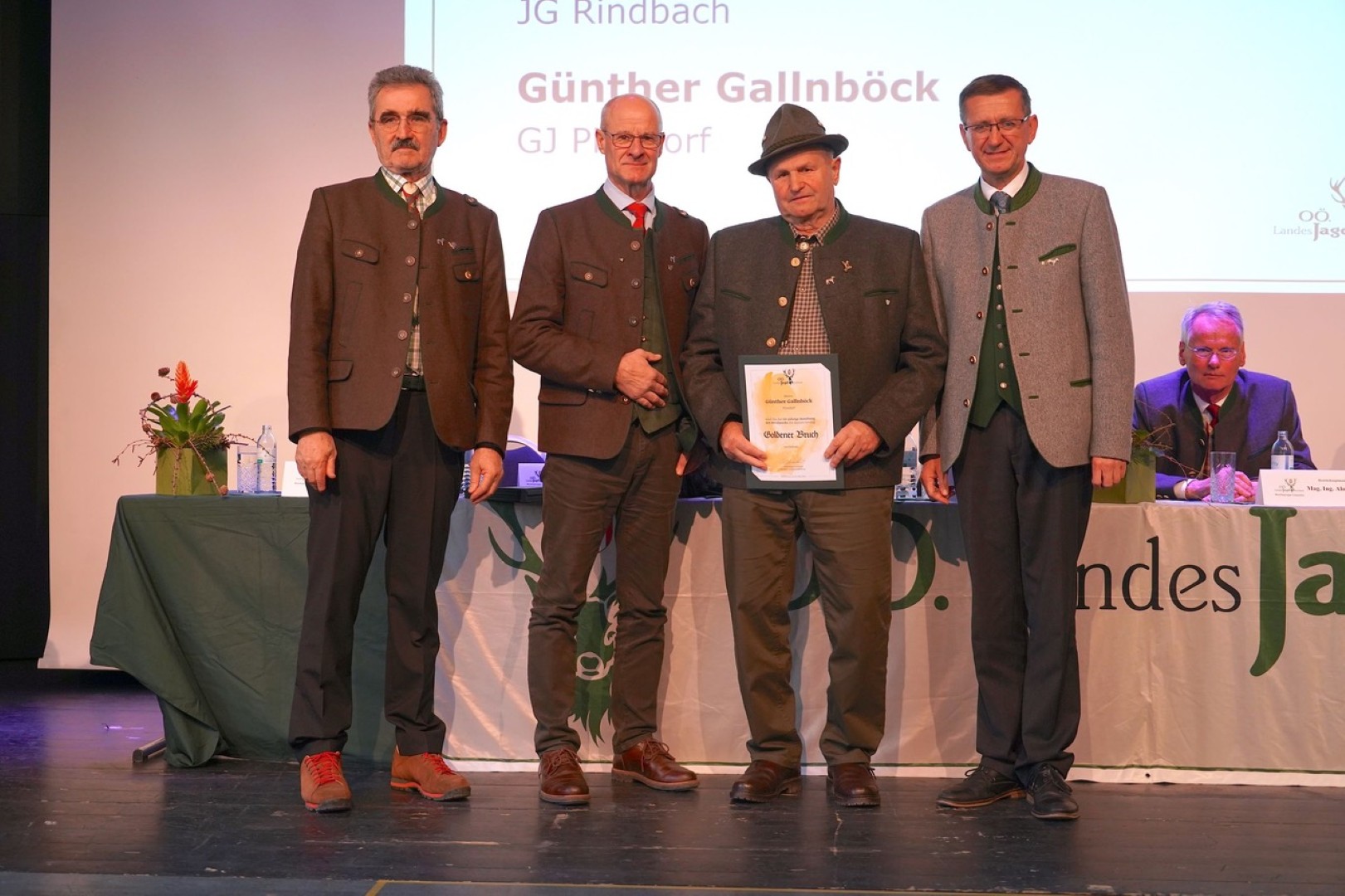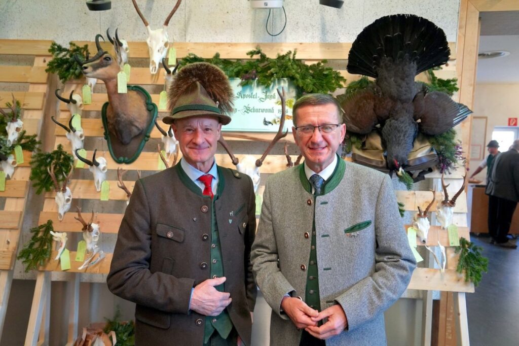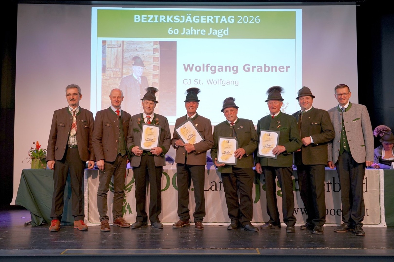 Ein erfreulicher Tagesordnungspunkt folgte mit den Ehrungen der Jägerschaft, die von LR Markus Achleitner, Landesjägermeister Herbert Sieghartsleitner und Bezirksjägermeister Johann Enichlmair durchgeführt wurden. Ein großer Teil der Geehrten kam aus dem Raum St. Wolfgang, wo auch BGM Franz Eisl mit auf die Bühne gekommen war. Ein feierlicher Augenblick, der auch mit Applaus der Jägerschaft begleitet wurde. Mit einem Weidmanns Heil für das kommende Jahr und ein Weidmanns Dank für das zahlreiche Erscheinen wurde dann der Bezirksjägertag 2026 durch Johann Enichlmair beendet und der gemütliche Teil bei Speis und Trank verlautbart.