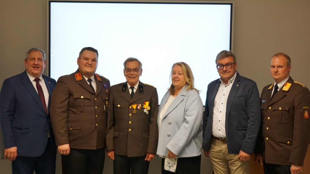 Sehr erfreulich war, dass wieder ein Kamerad – Resch Tobias – vom Bürgermeister Ing. Fritz Feichtinger zum aktiven Dienst angelobt wurden sowie 4 Kameraden wurden befördert Dr. Michael Kovacic wurde für 40 Jahre Feuerwehrdienst ausgezeichnet.