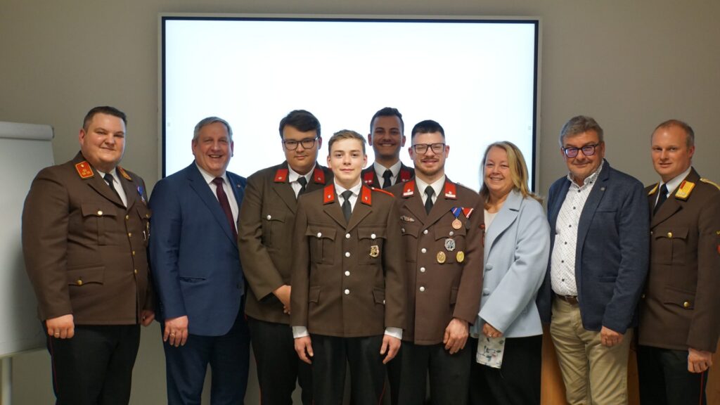von links nach rechts: Kommandant Bichler M, BGM Ing. Fritz Feichtinger, Lukas De Jager, Tobias Resch, Schimpl Gregor, Schupfer Patrick, VzBgm Mag. Christine Gabler, Feuerwehrreferent Peter Staudinger © FF Oberweis