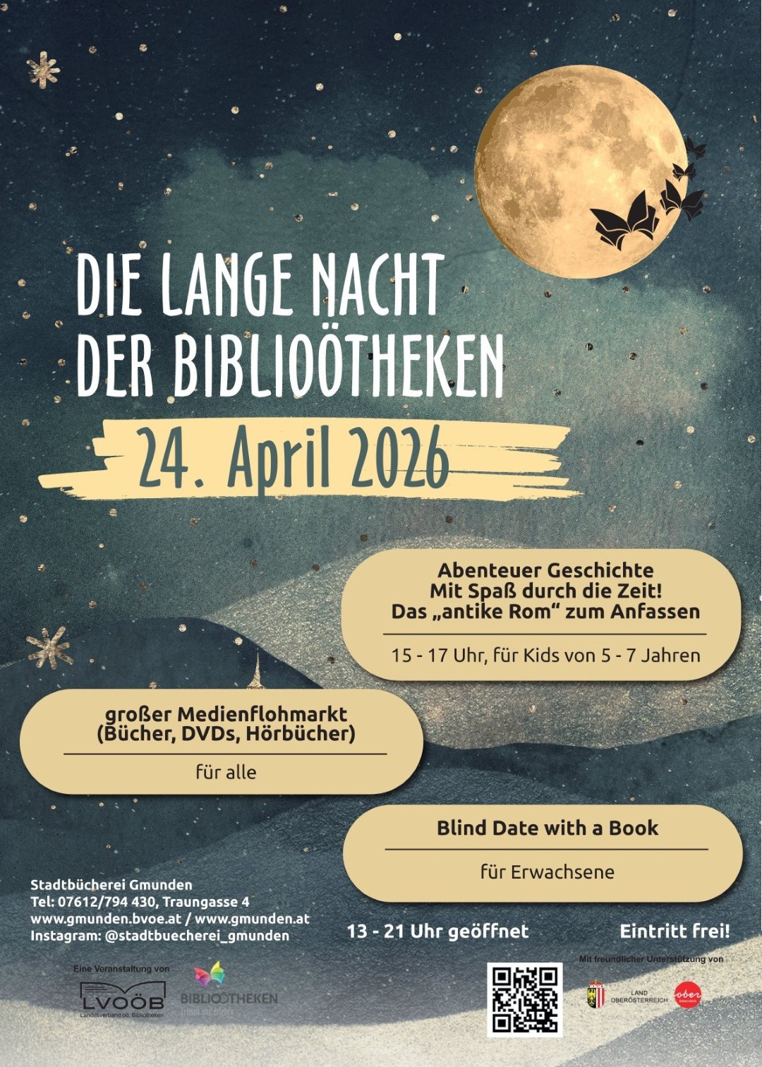 Die Stadtbücherei Gmunden wird am 24.04.2026 von 13.00 bis 21.00 Uhr geöffnet sein, denn die „Lange Nacht der BibliOÖtheken“ lädt an diesem Tag wieder landesweit dazu ein, die lokalen Hotspots der Literatur zu besuchen. Ein „Blind Date with a Book“, ein umfangreicher Medienflohmarkt, Snacks und Getränke sorgen zusätzlich für Kurzweiligkeit und Unterhaltung.