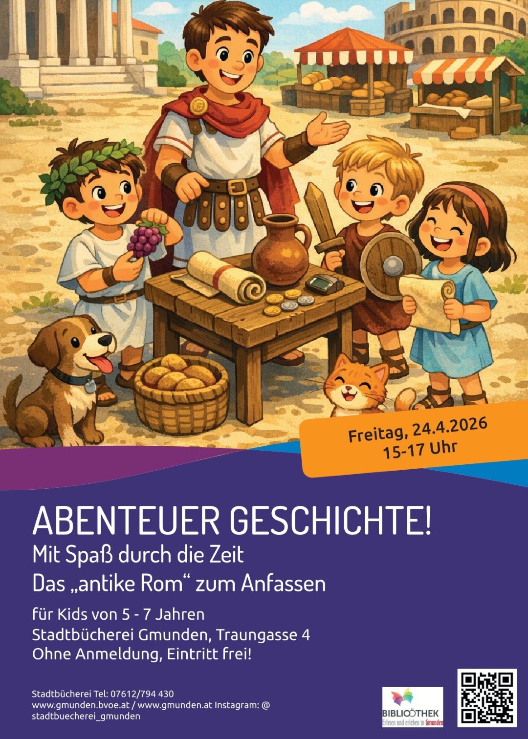 Geschichte zum Anfassen wird am Freitag, den 24.04.2026, von 15.00 bis 17.00 Uhr, in der „Lila Höhle“ der Stadtbücherei Gmunden geboten. Junge Zeitreisende entdecken zum Beispiel, wie die Alltagskleidung der Römerinnen und Römer ausgesehen hat und versuchen sich am Wickeln einer Toga. Oder sie spielen mit Kieselsteinen Mühle, ganz so wie die Kids im „alten Rom“! Auch das Schreiben auf Wachstafeln wird möglich sein, genauso wie das Kennenlernen der römischen Ziffern. Mädels und Jungs, die gerne etwas über das Leben der römischen Soldaten erfahren würden, und auch mal eine römische Rüstung anziehen möchten, sind hier genau richtig!