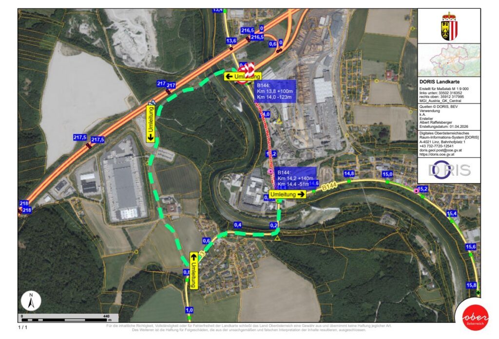 Auf einem rund 500 Meter langen Abschnitt der B144 (Str.-Km. 13,900 bis 14,400) werden zwischen 13. und voraussichtlich 17. April 2026 umfangreiche Sanierungsarbeiten durchgeführt. Bei Schlechtwetter kann sich die Fertigstellung bis in die Kalenderwoche 17 verschieben.