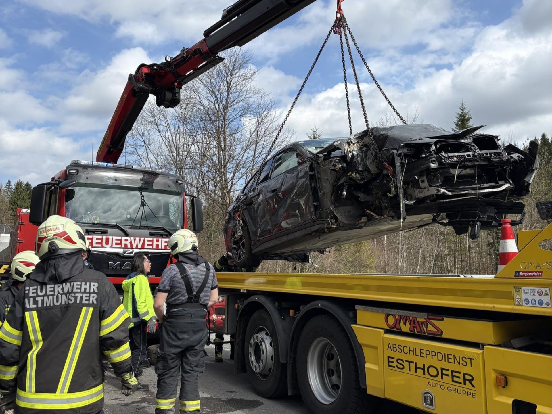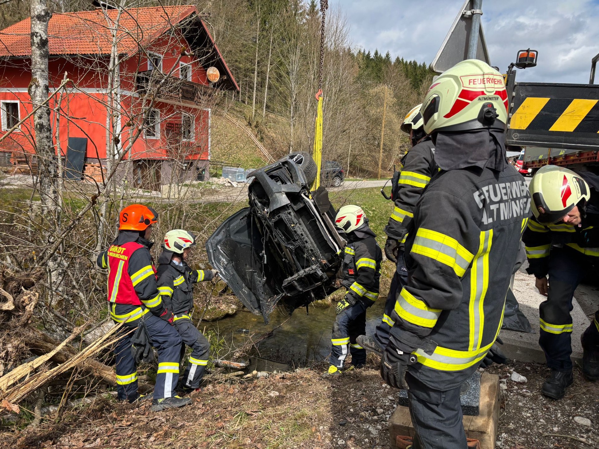 Nach dem Entfernen von kleineren und größeren Ästen konnte das verunfallte Elektrofahrzeug aus dem Bachbett gehoben werden. Anschließend wurde es einem Abschleppdienst übergeben. Für die Dauer der Bergungsarbeiten musste die Großalm-Landesstraße teilweise für den Verkehr gesperrt werden, berichtet die Feuerwehr Altmünster.