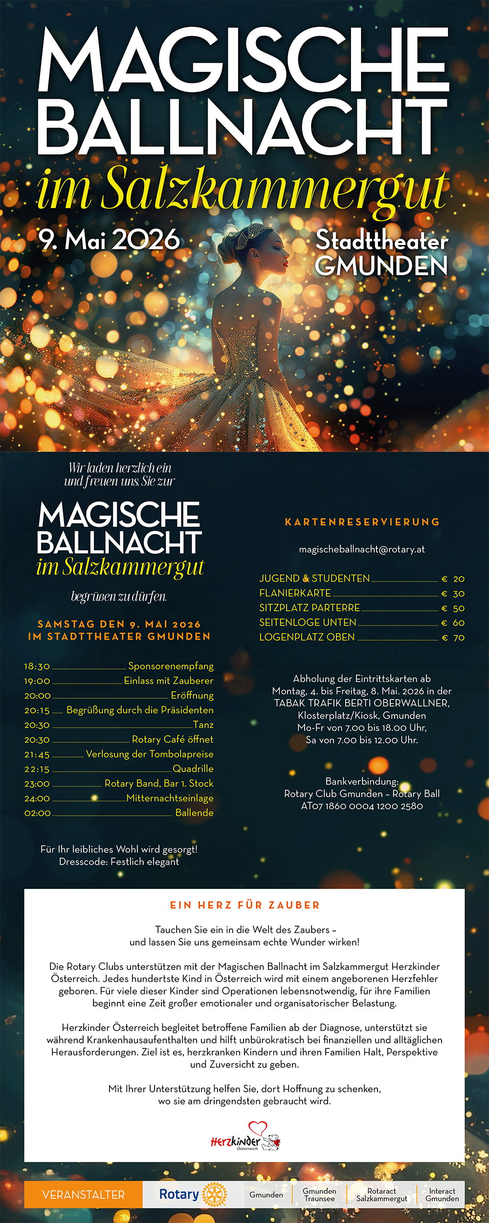 Organisiert wird die Ballnacht von den beiden Rotary Clubs in Gmunden sowie Rotaract und Interact. Der Reinerlös kommt „Herzkinder Österreich“ zugute. Jedes hundertste Kind in Österreich wird mit einem angeborenen Herzfehler geboren. „Herzkinder Österreich“ begleitet betroffene Familien ab der Diagnose und unterstützt sie während Krankenhausaufenthalten sowie in belastenden Lebenssituationen.