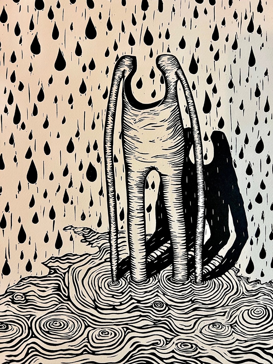 Michael Stockhammer (Konfus Clothing, Gmunden) bringt Schwarzweißgrafiken mit, die aus dem Zusammenspiel von Illustration, Linolschnitt und Holzdruck entstehen. Sein autodidaktischer Weg führte ihn von Acryl- und Aquarellmalerei über Specksteinschnitzerei zum grafischen Druck — beeinflusst von amerikanischen und japanischen Tattoo-Traditionen sowie vom klassischen Surrealismus. Das Ergebnis ist eine klare, kontrastreiche Bildsprache mit eigenem Wiedererkennungswert.