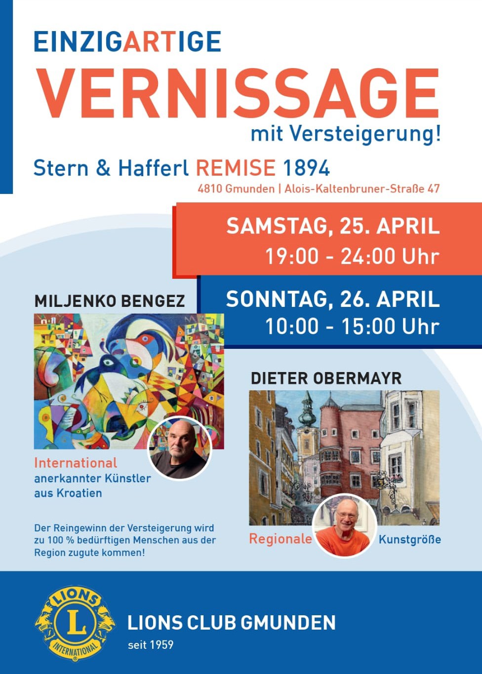 Gmunden. Der Lions Club Gmunden lädt am 25. und 26. April zu einer besonderen Vernissage in die Stern & Hafferl Remise ein. In diesem einzigartigen Ambiente präsentieren der international anerkannte kroatische Künstler Miljenko Bengez und der regionale Kunstschaffende Dieter Obermayr eine Auswahl ihrer Werke.