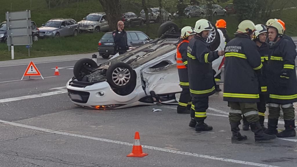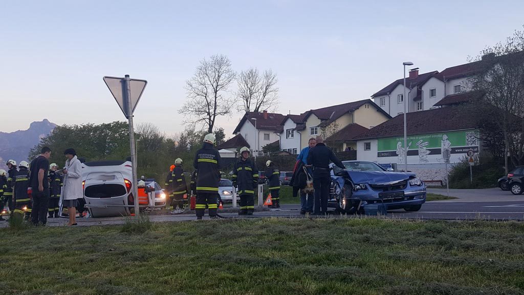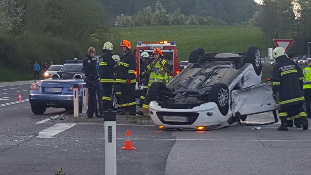 Am 21. April 2016 gegen 19:30 Uhr fuhr ein 25-Jähriger aus Graz auf der B145, Salzkammergutstraße Richtung Altmünster. Im Gemeindegebiet von Gmunden wollte er nach links abbiegen. Dabei dürfte er ein aus Altmünster kommendes Auto, gelenkt von einem 55-Jährigen aus Schlüßlberg, übersehen haben. Der 55-Jährige konnte nicht mehr rechtzeitig anhalten und stieß frontal in die rechte Fahrzeugseite des 25-Jährigen. Dabei überschlug sich dessen Auto und blieb am Dach liegen.