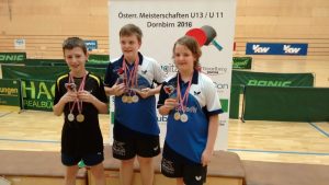 Im U13-Bewerb glänzte die Bronzemedaille um den Hals von Romy Josefa Reiter (U. Higra Spk. Waizenkirchen), die sich im Halbfinale Natasa Djordjevic (Sbg) geschlagen geben musste. Djordjevic gewann schlussendlich auch diesen Bewerb. Bei den Burschen durchbrach Andre Pierre Kases die starke Phalanx aus NÖ. Sicher ins Finale marschiert, stand es gegen Samuel Ameti (NÖ) plötzlich 0:3 und 2:5 aus der Sicht des Freistädters. Dass er dieses Ding trotzedem zu seinen Gunsten noch drehen konnte, war ein echtes Husarenstück des jungen TT-Talents und ließ Betreuerteam und Anhang jubeln. Mit zusätzlichem Gold im Doppelbewerb (mit Partner Markus Hintersteiner/NÖ) kürte sich Kases zum erfolgreichsten Spieler dieser ÖM. Elena Pöll/Romy Reiter erreichten im Mädchen-Doppel den 3. Rang – somit waren auf jedem Podium dieser ÖM OÖTTV-Spielerinnen vertreten.
