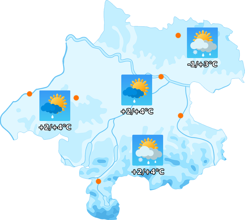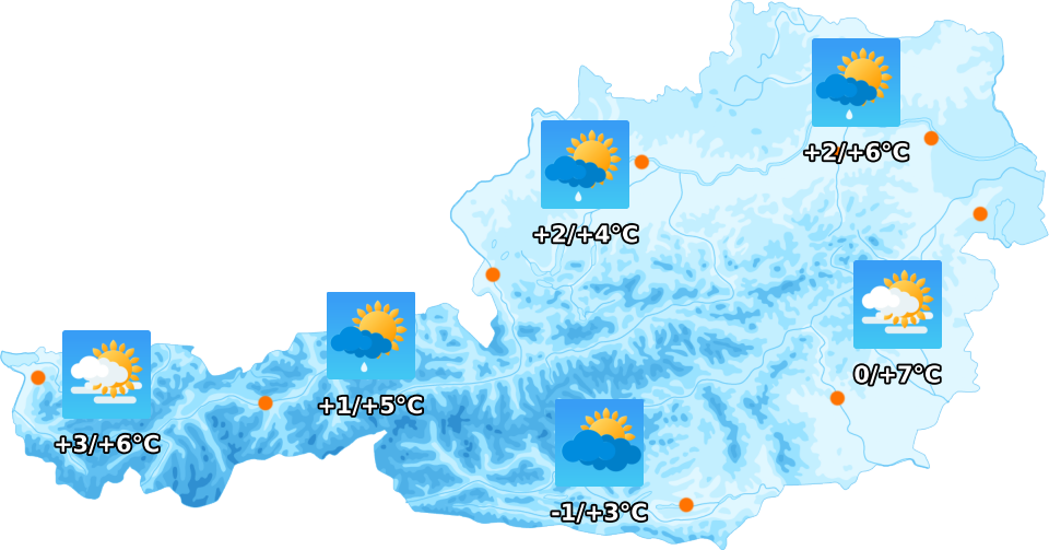 Der Montag beginnt in weiten Teilen des Landes trüb mit etwas Regen, oberhalb von 900 Meter schneit es unergiebig. Stellenweise besteht auf den kalten Böden erhöhte Glättegefahr! Vormittags klingen die Niederschläge mehr und mehr ab, es lockert aber auch danach nur zögerlich auf. Die besten Chancen auf etwas Sonne gibt es am Nachmittag im südlichen Bergland. Die Höchstwerte erreichen +3 bis +4 Grad.