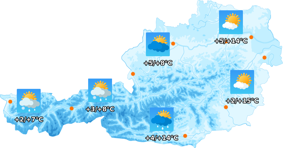 Auch zu Beginn der neuen Woche bleibt es wechselhaft. Mit lebhaftem Westwind regnet es am Montag vor allem in der Früh und dann wieder am Nachmittag, dazwischen zeigt sich zumindest zeitweise die Sonne. Die Höchstwerte bewegen sich zwischen +9 und +11 Grad. Der Dienstag bringt vor allem südlich der Donau etwas Niederschlag, für den Mittwoch kündigt sich weitgehend trockenes Wetter an.