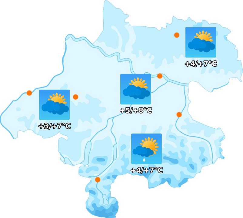 Der Sonntag verläuft bewölkt und spürbar kühler als zuletzt. Am Vormittag regnet es vor allem zwischen dem Innviertel und dem Salzkammergut ein wenig, oberhalb von 800 Meter schneit es unergiebig. Nachmittags überwiegen dann überall die trockenen Phasen, gelegentlich lockert es ein wenig auf. Bei leichtem bis mäßigem Westwind liegen die Höchstwerte zwischen +4 und +8 Grad.