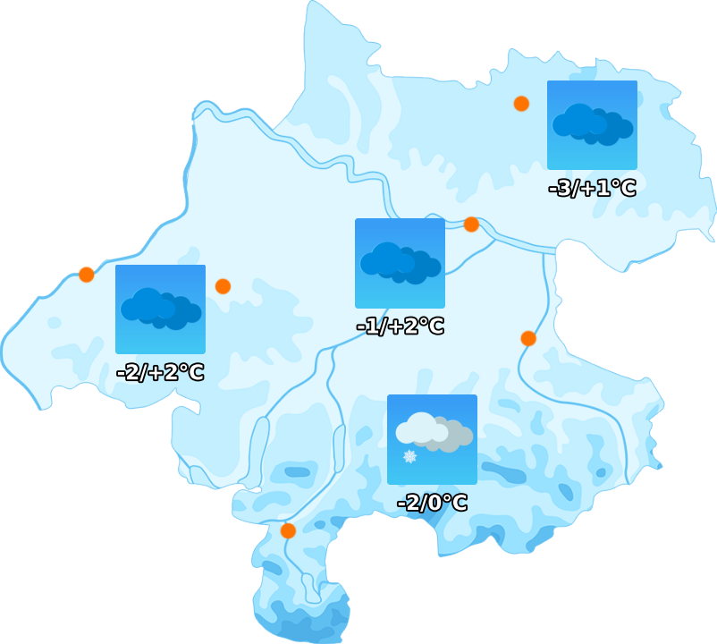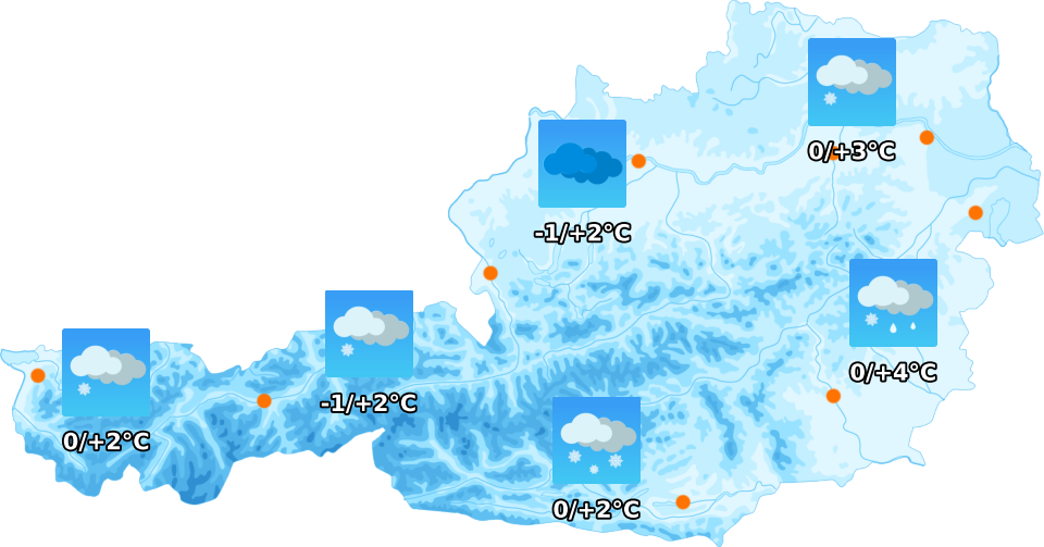 Ein schwaches Italientief sorgt am Freitag für bewölktes Wetter, vor allem im Gebirge sowie im Alpenvorland gibt es etwas Schneefall bis in tiefe Lagen, vereinzelt kann es auch im Zentralraum und im südlichen Innviertel leicht schneien. Die Temperaturen sind winterlich bei -3 bis +2 Grad.