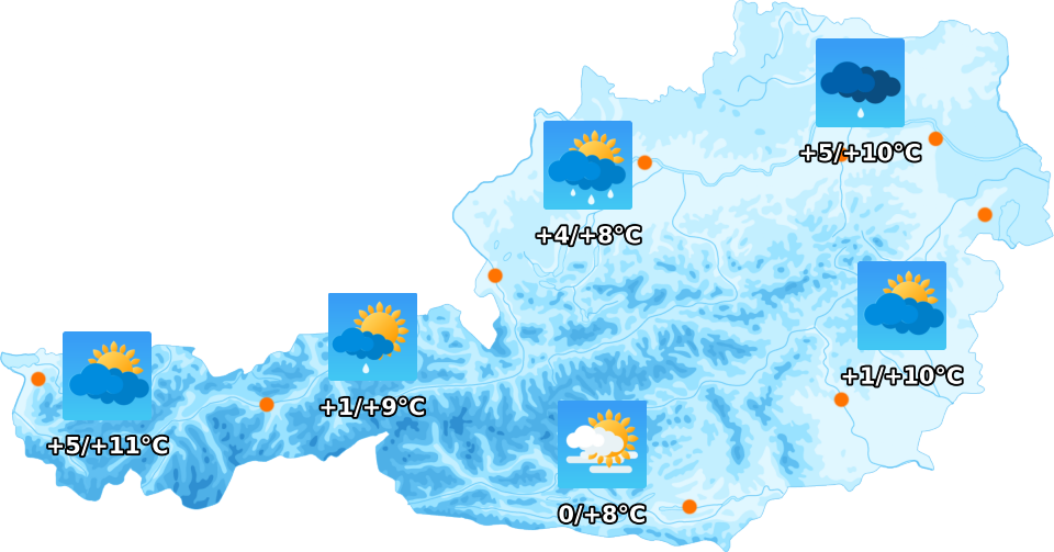 Die neue Woche beginnt windig und unbeständig. Dabei überwiegen am Montag die Wolken und es regnet vor allem in den südlichen Landesteilen häufig, nördlich der Donau gibt es speziell am Nachmittag auch trockene Abschnitte. Es bleibt mild mit Höchstwerten zwischen +8 und +11 Grad. Trüb und regnerisch präsentiert sich dann auch der Dienstag, im Nordstau der Alpen sind dabei größere Regenmengen zu erwarten. Am Mittwoch beruhigt sich das Wetter, die Temperaturen steigen auf Werte um +15 Grad.