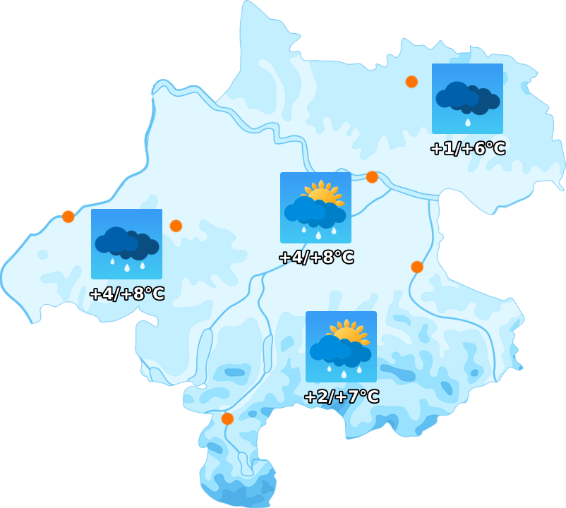 Eine milde Nordwestströmung sorgt am Sonntag für trübes und meist regnerisches Wetter, die Sonne kommt kaum zum Vorschein. Am wenigsten Niederschlag fällt insgesamt im Mühlviertel, hier gibt es stellenweise auch längere trockene Phasen. Es weht teils lebhafter Westwind, die Höchstwerte erreichen +6 bis +9 Grad.