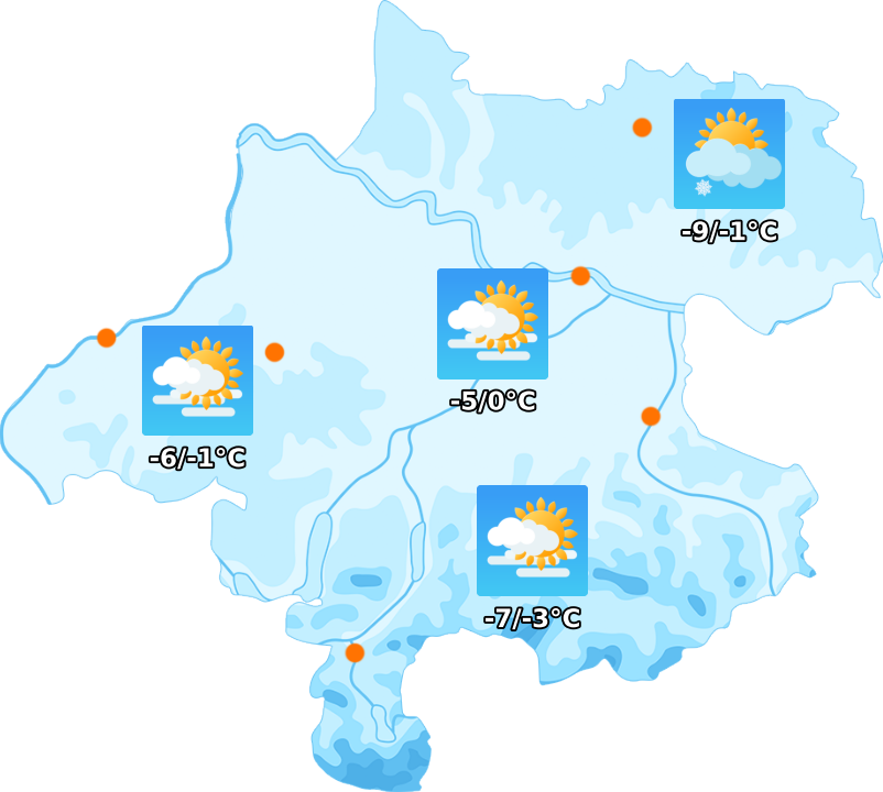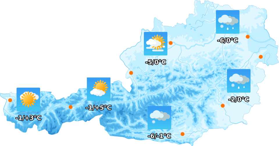 Der Samstag verläuft in den Niederungen wieder häufig nebelig, darüber zeigt sich zumindest am Vormittag noch zeitweise die Sonne. Am Nachmittag werden auch hier die Wolken dichter und es kann vereinzelt leicht schneien. Die Temperaturen starten bei -9 bis -5 Grad und erreichen Höchstwerte von -3 bis 0 Grad.